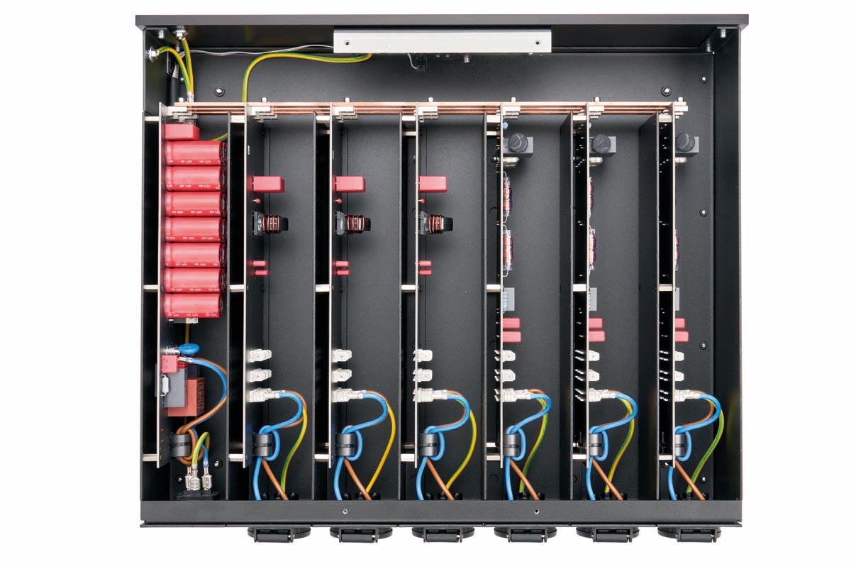 Kommen wir zu den Produktdetails dieser Netzversorgungsstation (mit/im Komponentenstatus). Die separat abgeschirmten Steckdosengruppen lassen sich je nach Wunsch konfigurieren und unterscheiden sich in ihren Filtern. Der Typ I wird genutzt bei analogen Verbrauchern. Er eliminiert hochohmige Störungen durch Ableitung des Stromes über Spulen. Beim Typ II (für digitale Geräte) werden die niederohmigen Störungen auf Masse gelegt – sprich, über die Erde abgeführt. Allen Filtern gemein ist eine gesicherte Gleichstromunterdrückung. Dieser Fakt ist in unseren mit reichlich Strom aus PV-Anlagen belasteten Netzen mittlerweile wesentlich. Warum ist das so? Nun, vorhandene Gleichspannungsanteile – der sogenannte „DC-Offset“ – erzeugt z. B. durch einseitiges Nutzen der 50-Hertz-Sinuswelle von irgendwelchen Haushaltsgeräten – zeigen sich durch vernehmliches Trafobrummen. Selbiges wird durch einen Filter bereits im Eingangsboard des AC-4500 effektiv verhindert.