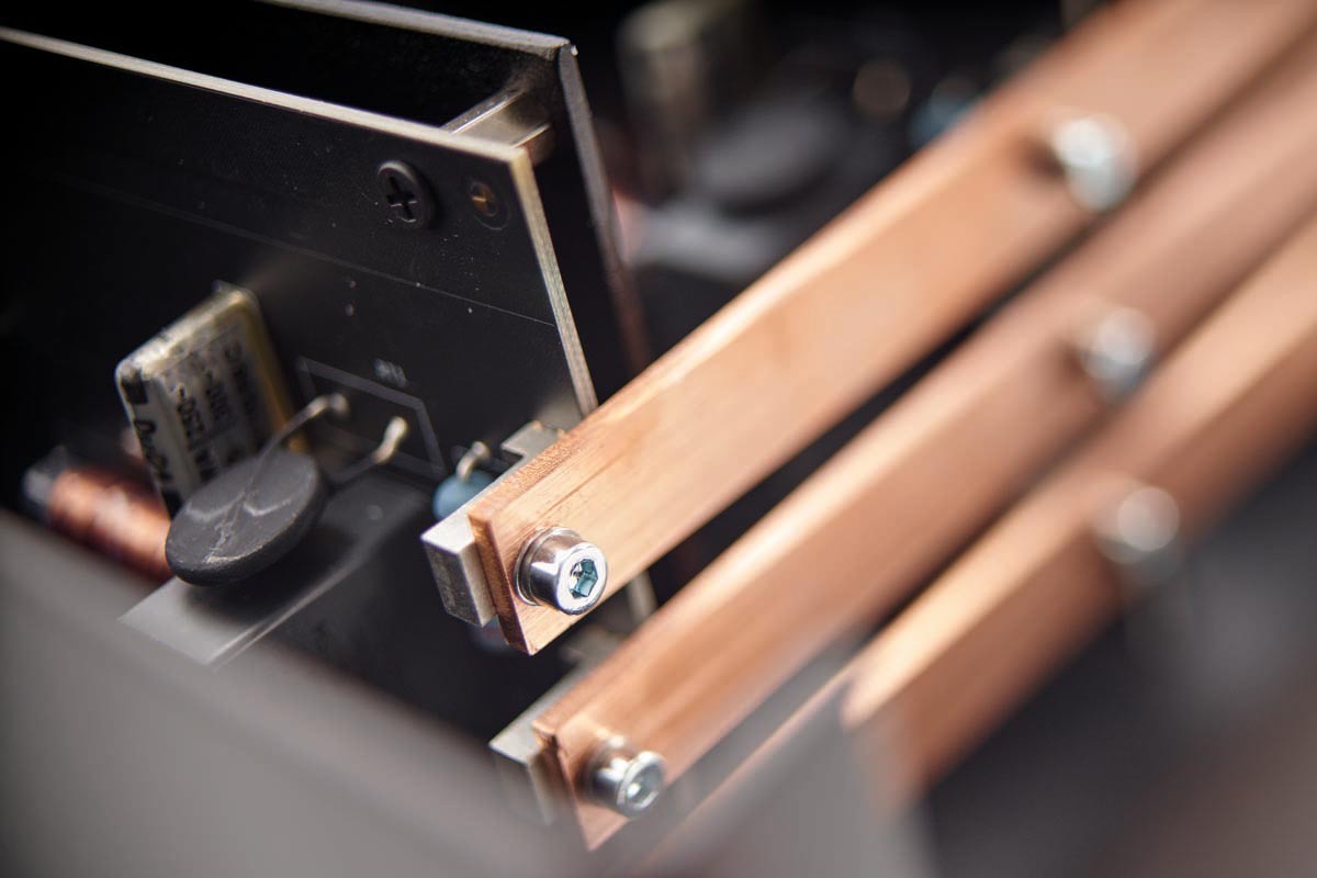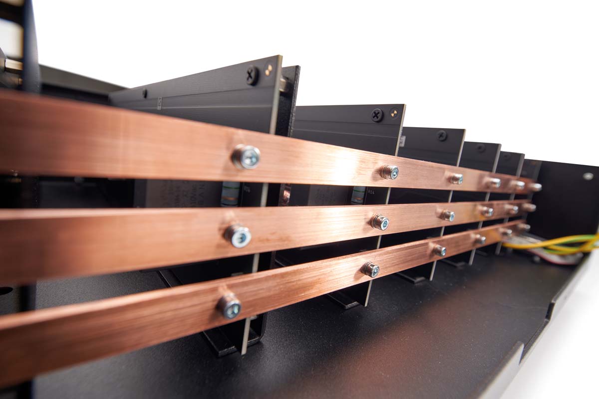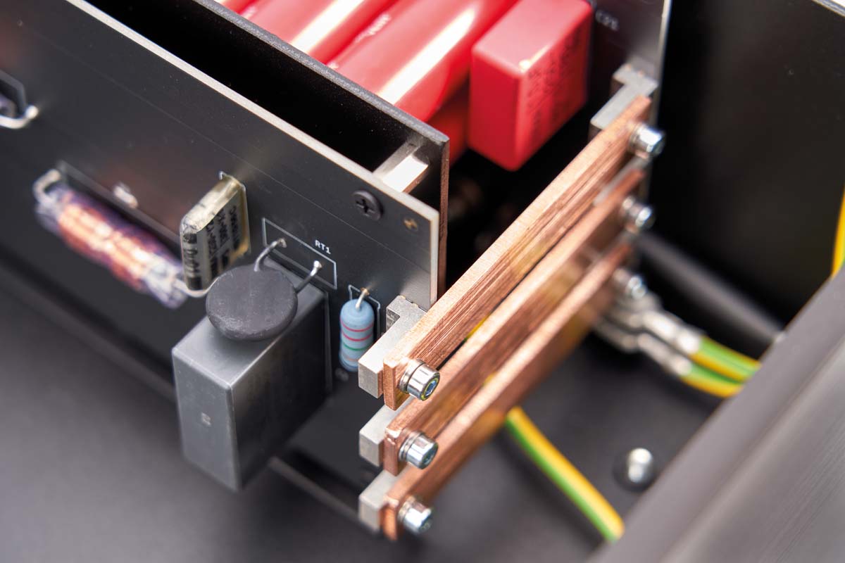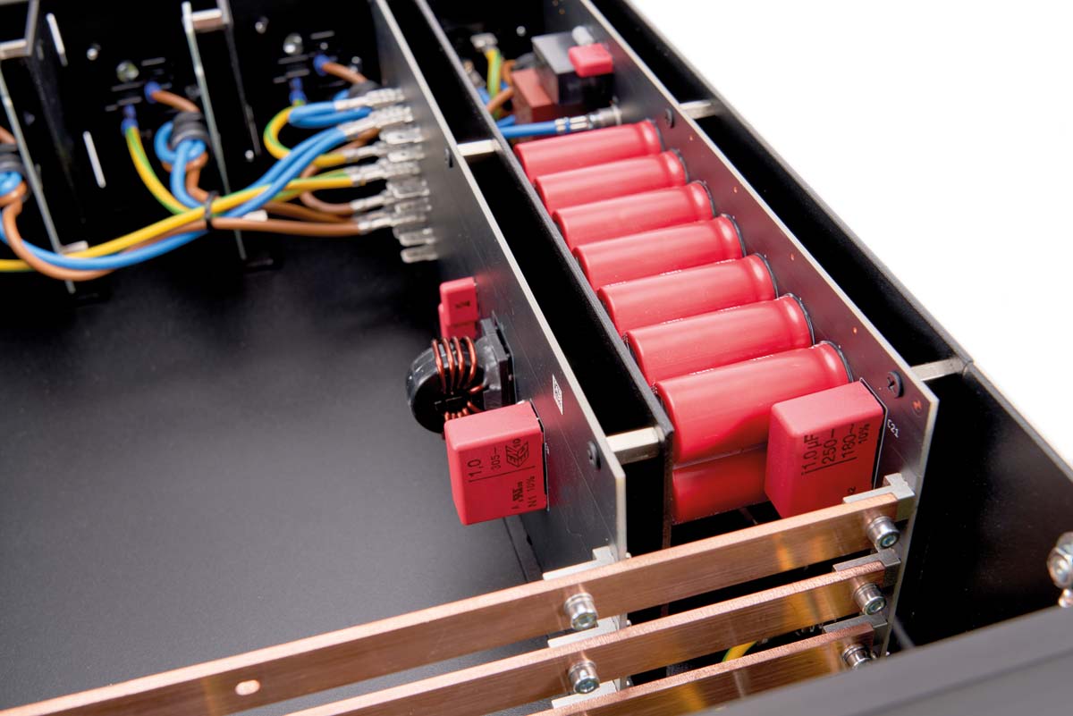 Die über alle Pole gesicherte Netztrennung sorgt unter Mithilfe von Ferritkernen für saubere Stromverhältnisse an jedem der sechs Steckplätze. Intern kommen massive, verschraubte Kupfer-Stromschienen zum Einsatz – Lötstellen gibt es hier ganz absichtlich nicht. Schnell vorab festgestellt: Dadurch ist eine außergewöhnlich gute Stromlieferfähigkeit gegeben. Auch an dieser Stelle setzt sich der Entwicklergenius bei in-akustik durch, denn durch die verschraubten Kontakte wird der Schleifenwiderstand niedrig gehalten, was sich letztlich in einem ungehinderten Stromfluss bemerkbar macht. In der Tat ist der durch eine verlötete Kontaktstelle entstehende Widerstand im Stromfluss (messbar) höher, weshalb sich die Entwickler bei in-akustik für geschraubte Kontaktstellen entschieden. Genau solche Details zeichnen die Stromversorgung AC-4500 im besonderen Maße aus. Da steckt ganz einfach viel „Hirnschmalz“ drin!