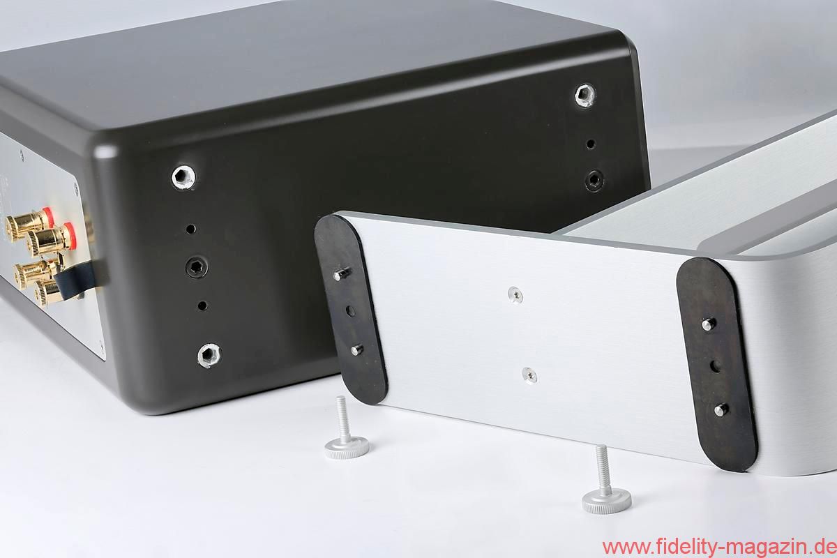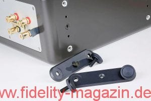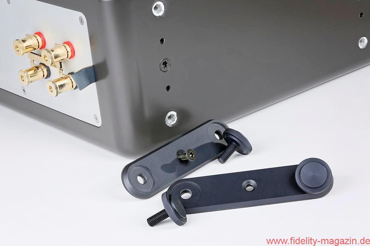 Davon abgesehen ringt mir die professionelle Konsequenz, mit der bei Inklang eigentlich einfache Fragen der mechanischen Stabilität angegangen werden, gehörigen Respekt ab. Da ist man als High-End-Redakteur auch in höchsten Preislagen durchaus simplere Lösungen gewöhnt. Nehmen wir als herausragendes Beispiel die Verbindung der 13.2 zu ihrem optionalen Stativ unter die Lupe: Unter den Lautsprechern befinden sich zwei breite Stege mit Gewindeaufnahmen für die flachen Rändel-Füße von Inklang. Normale M8-Spikes (oder was der Zubehörmarkt sonst so zur An- oder Entkopplung bereithält) passen natürlich ebenfalls. Aber man kann diese Stege auch einfach abschrauben, darunter kommen zwei Löcher zum Vorschein, in die kleine – selbstverständlich mitgelieferte – Metallzapfen passen. Löcher im selben Abstand finden sich auch in den Stativen, sodass die Box im Grunde schon fixiert ist, bevor man sie mit zwei Rändelschrauben von unten tatsächlich festschraubt, also FESTschraubt. Auf dieses Weise bilden Lautsprecher und Stativ eine unzertrennliche und kraftschlüssige Einheit – eine vorbildliche Lösung, die sich andere Hersteller gerne mal genauer anschauen dürfen!
