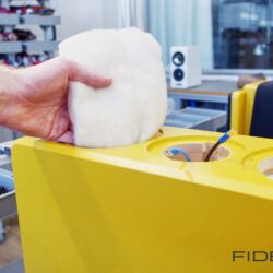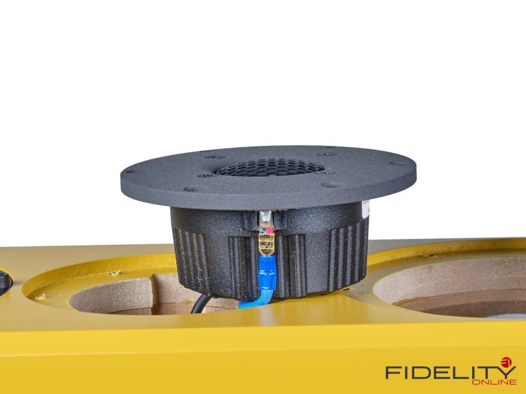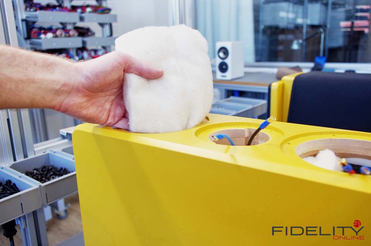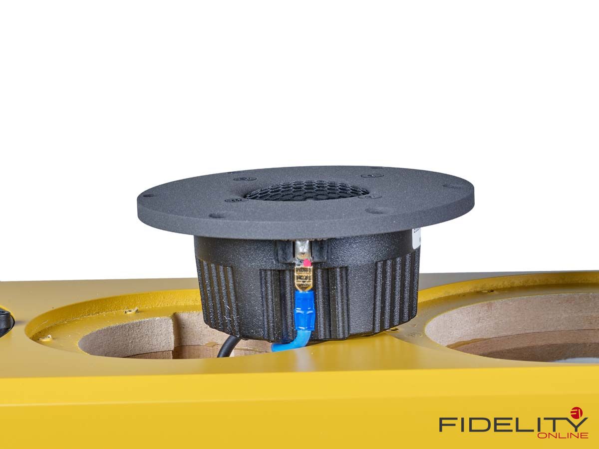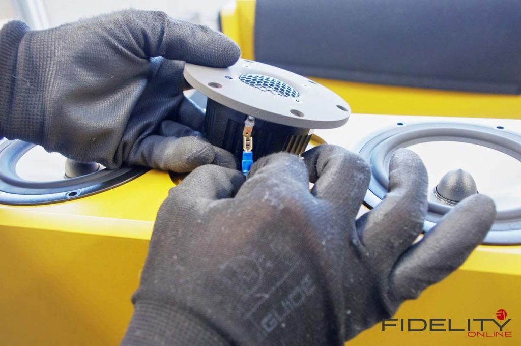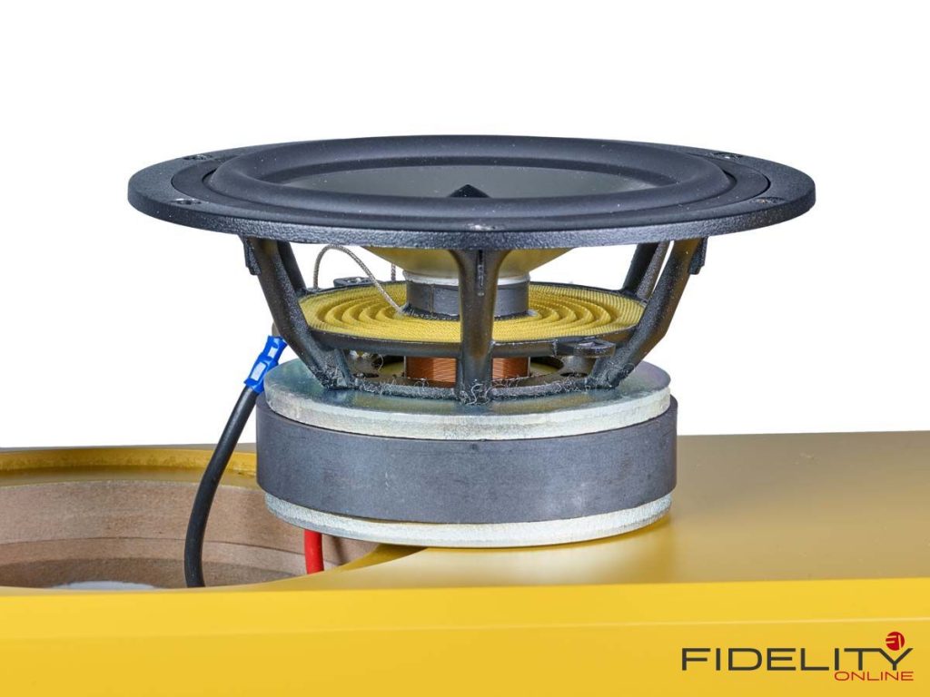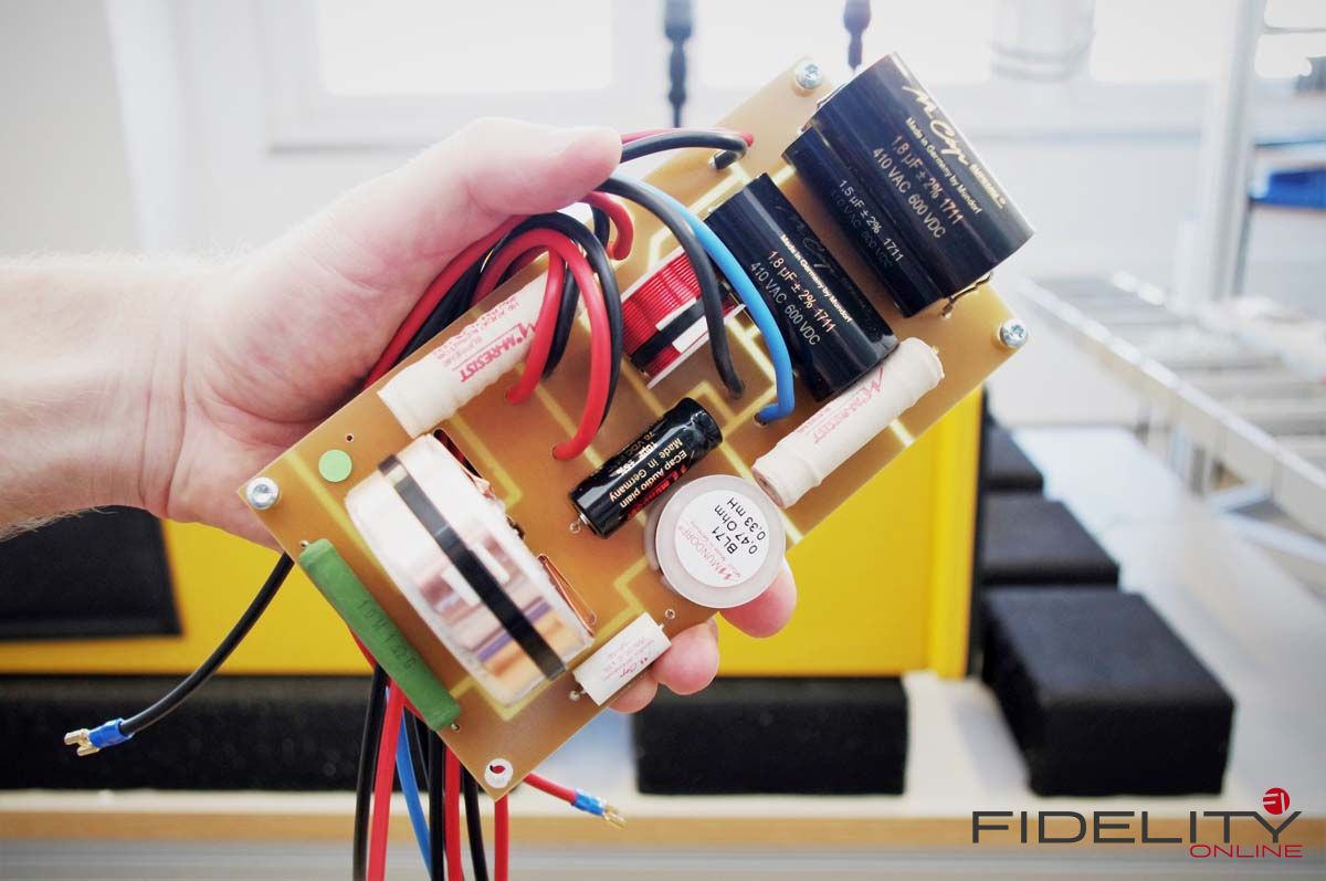 Im Fall unserer senfgelben Schmuckstücke übernehmen mit induktionsfreien Supreme-Kondensatoren, vergossenen Widerständen der audiophilen Spitzenklasse sowie Flachdrahtspulen von Mundorf bestückte Frequenzteiler des Referenz-Upgrades (nach redaktionsinterner Meinung eine erstaunlich günstige und somit unverzichtbare Investition in eine nochmals sinnlichere Wiedergabe) die Aufteilung des Signals auf die einzelnen Chassis. Die typische Anordnung dieser Chassis nach Josef A. D’Appolito mindert üblicherweise auftretende frühe Reflektionen von Decke und Boden und sorgt so für die faszinierende Räumlichkeit der 13.3. Ein Hochtöner mit 29-mm-Kalotte übernimmt dabei die zentrale Position, um die sich zwei Tiefmitteltöner mit zierlich wirkenden 15-cm-Membranen gruppieren. Die Chassis mit ihren charakteristischen Magnesiummembranen liefert der skandinavische Spezialist SEAS nach Hamburg zur Endmontage.