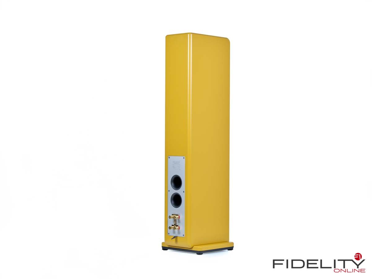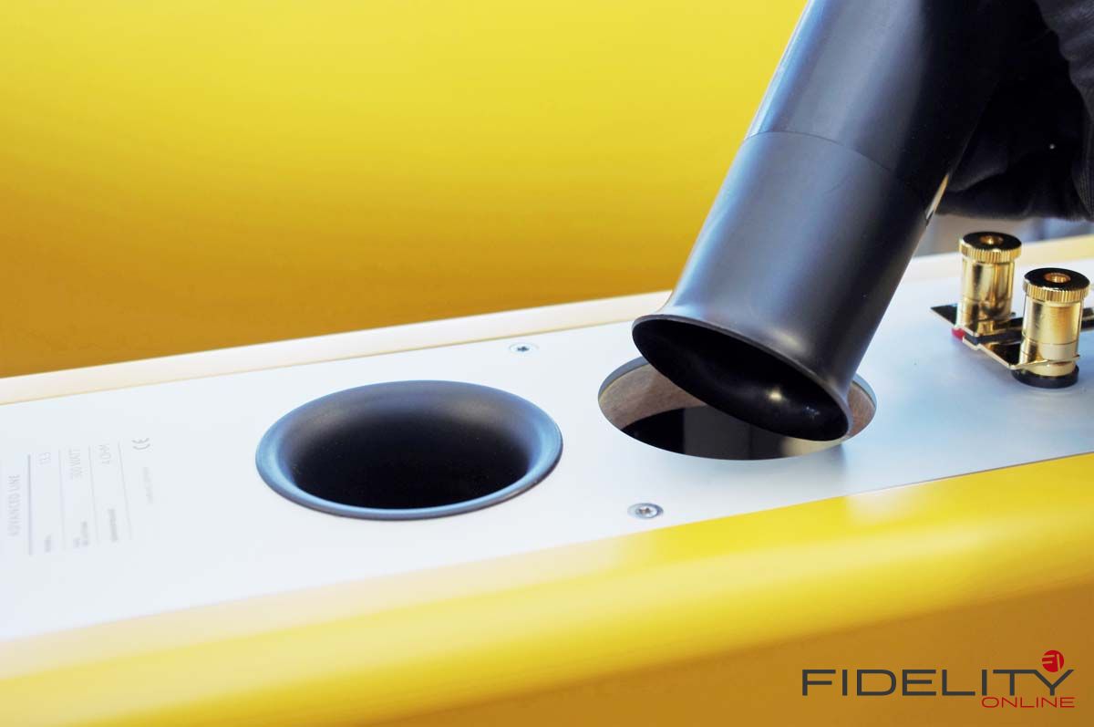 Rückseitig finden sich die Trompeten der Bassreflex-Öffnungen und massive Lautsprecheranschlüsse mit genug Klemmkraft selbst für schwere Kabel und massive Stecker. Die doppelte Ausführung der Klemmen erlaubt sämtliche Varianten an kabeltechnischen Experimenten oder den Antrieb mit gleich mehreren Endstufen.