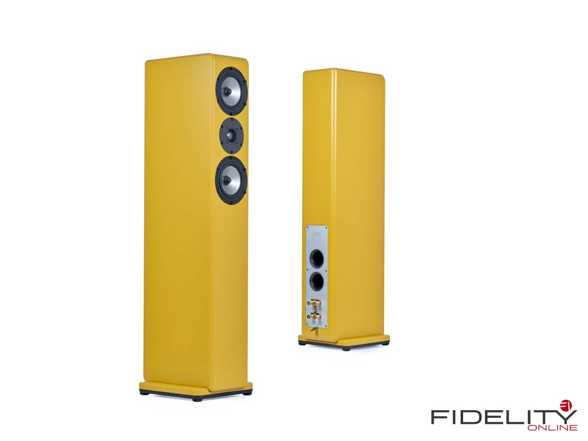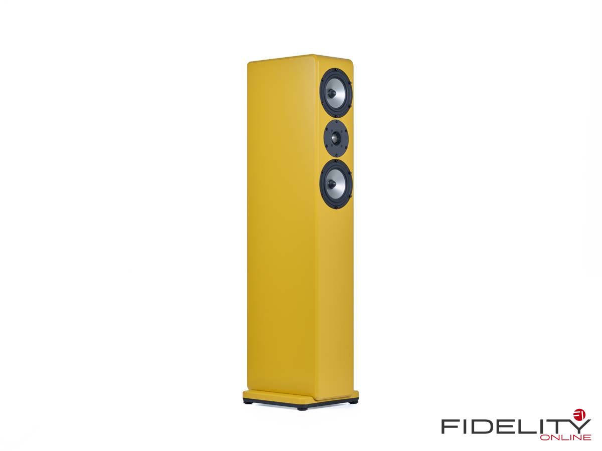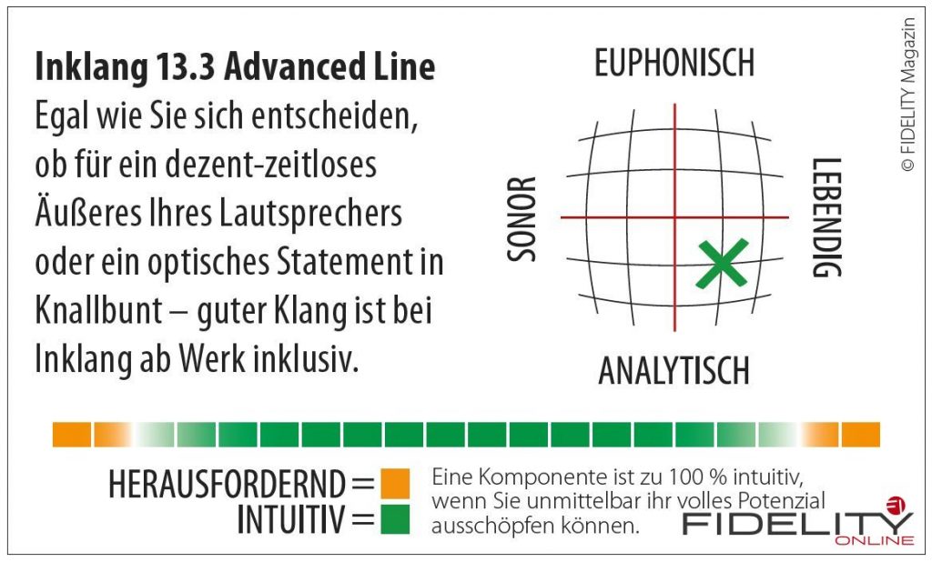 Damit man bei all den Optionen den Überblick behält, hilft Inklangs Online-Konfigurator, den optimalen Lautsprecher zu finden. Man beginnt mit der Raumgröße, definiert den gewünschten Standort zu Hause und wählt das Leistungsspektrum des vorhandenen oder geplanten Verstärkers. Mit jeder Angabe wird die Auswahl der infrage kommenden Modelle weiter verfeinert. So vermeidet akustischen Schiffbruch, wer mit dem Gedanken spielt, Dreiwege-Lautsprecher wie das Topmodell 17.5 (www.fidelity-magazin.de) in eine Dachkammer zu quetschen. Ist das passende Modell gefunden, beginnt die Suche nach der optimalen Farbe. Schon die zehn regulären Farben sollten im Regelfall ausreichen, eine stimmige Lösung zu finden. Wer beispielsweise zu herbstlichen Stimmungsschwankungen neigt, platziert seine senfgelben Boxen wie ich vor apfelgrüner Wand. Weitere sinnvolle Optionen wie Frontgitter, die Wahl zwischen Ankopplung per Spikes oder lieber bodenschonenden Standfüßen, hauseigene Lautsprecherkabel und ein Family-Care-Paket machen die Individualisierung perfekt.