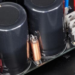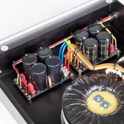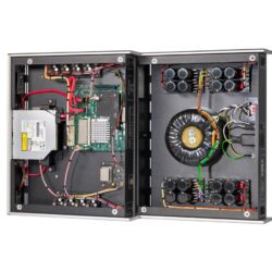 Das untere und entschieden gewichtigere Gerät enthält acht separate Trafos, die bewusst ungefiltert bleiben. Der Strom wird über besagte Strippen in die Haupteinheit des Servers übertragen. Erst hier sitzen acht gefilterte Netzaufbereitungen genau an – oder besser noch „in“ – den Baugruppen, die sie speisen. Auf die Weise müssen die verhältnismäßig geringen Nutzströme keine Strecken mehr zurücklegen, was ihre Störanfälligkeit verringert. Allein das Mainboard nimmt vier Zuleitungen ein. Die übrigen Begünstigten sind der USB-Ausgang, die SSD-Festplatte sowie jeweils die Taktgeber des USB- und des Ethernet-Controllers.
