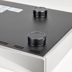 Der Statement ist auf zwei Gehäuse verteilt, was mich direkt am Anfang unseres Gesprächs zu einer Frage führt: Die mitgelieferten Verbindungskabel sind sehr kurz, und ich möchte wissen, ob es längere Varianten gibt, damit ich die Komponenten in separate Ebenen meines Racks stellen kann. „Ja, die haben wir, man kann sie auch bestellen. Aber bitte nicht!“, lautet sein überraschend eindringlicher Appell. Die Gehäuse seien extra aufeinander abgestimmt worden, ihre dicken Frontplatten besitzen eine ergänzende Linie und sollten schon der Optik halber direkt übereinanderstehen. Außerdem habe die Auftrennung absolut nichts mit Vibrationen zu tun, man könne audiophile Bedenken daher getrost zur Seite schieben. Die Aluminiumwände beider Gerätewannen sind 10 Millimeter stark, dämpfende sowie asymmetrisch angeordnete Absorber-Füße tun ihr Übriges. Insgesamt wiegt der Statement damit fundamentale 22 Kilogramm. Da rappelt, vibriert oder resoniert garantiert nichts.