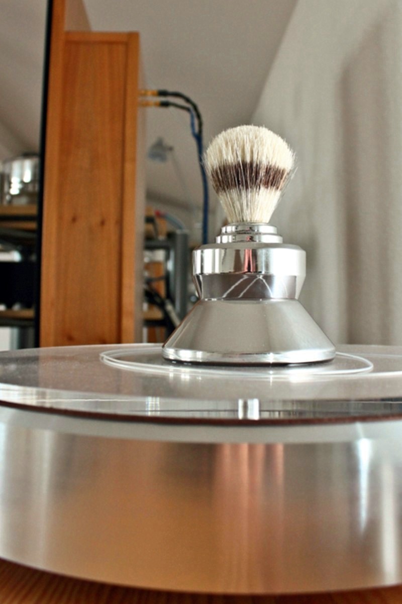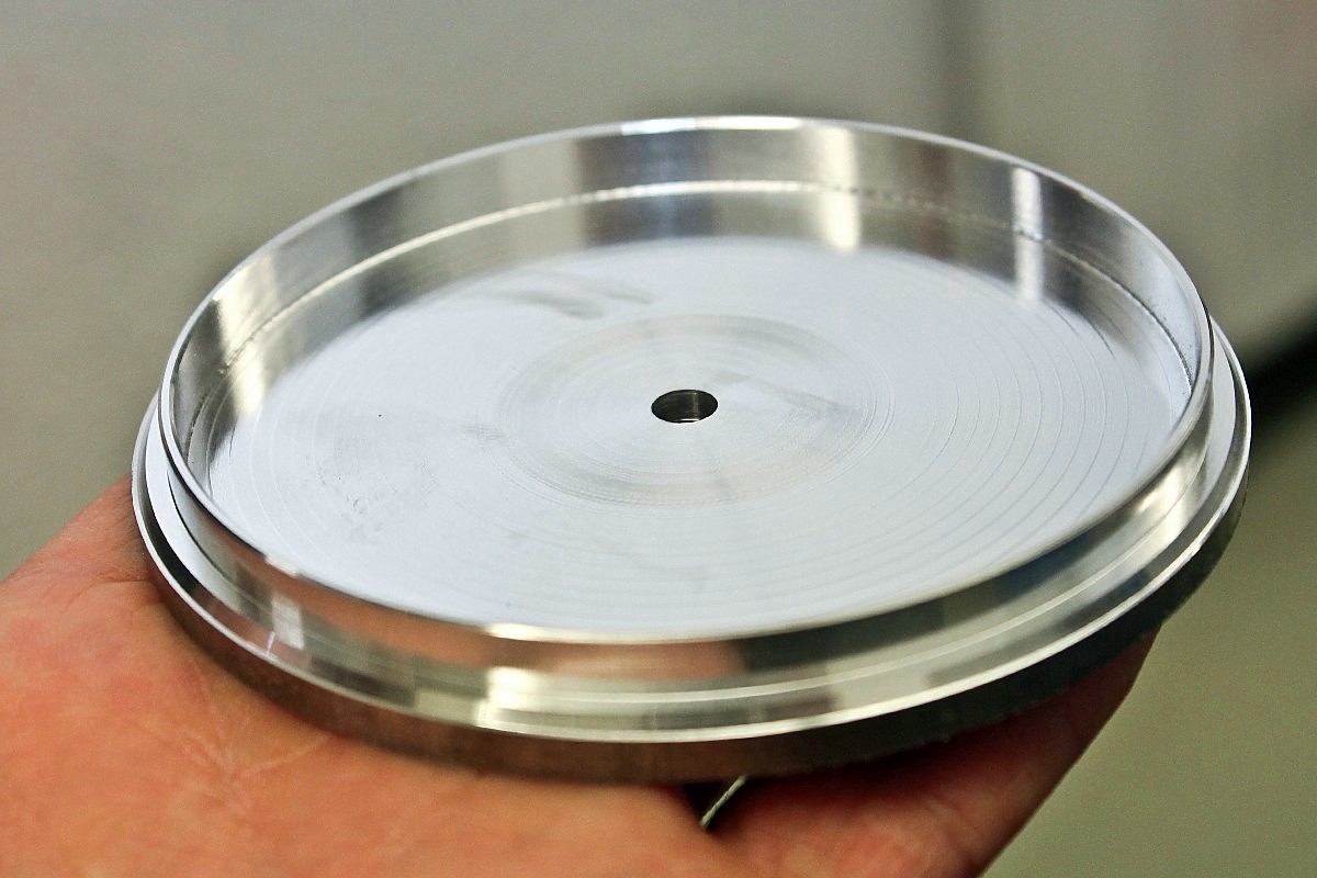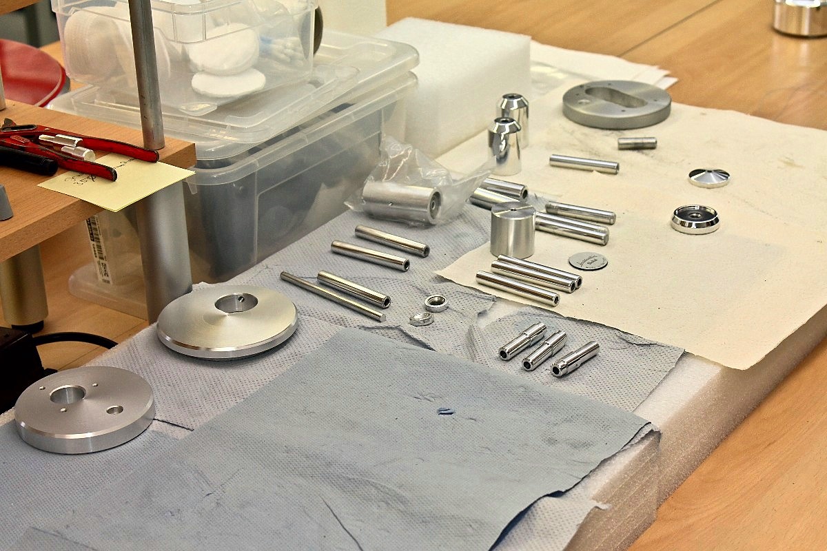 Holzteile lässt Acoustic Solid zwar bei einem zuverlässigen Schreiner in der Nähe anfertigen, und auch bei den Tonarmen gibt es ein paar Bauteile, die nicht made by Wirth Tonmaschinenbau sind, der Lift etwa, den man von Rega bezieht. Insgesamt aber darf Karl Wirth voller Stolz behaupten, dass seine Firma eine echte Manufaktur ist, schließlich vereinigen sich hier mehrere Disziplinen einer höchstqualitativen Fertigung unter einem Dach. Hier werden massive Aluminiumblöcke in feine Scheiben gesägt, mit CNC-Maschinen bearbeitet und zu Motordosendeckeln oder Basen für Laufwerke oder Tonarme veredelt. Hier werden die unterschiedlichsten Präzisionsdrehteile feinstgewuchtet, hochglanzpoliert und zu beeindruckenden Plattentellern geformt. Und dann demonstriert uns der Chef in aller Ausführlichkeit sein eigenes Tellerlager-Ensemble, dessen Buchse aus einem speziellen Hightech-Kunststoff gegossen wird und das derart enge Toleranzen ermöglicht, dass zwischen Tellerachse und -buchse ein Spaltmaß nahe null herrscht. Wir bewegen uns hier am Limit des technisch Möglichen, und selbst Kollege Kraft, mit derlei Werkzeugen auf Du und Du, zeigt höchsten Respekt für den Gerätepark und ist insbesondere von Fertigungstiefe und -qualität tief beeindruckt.
