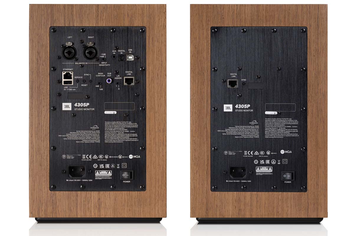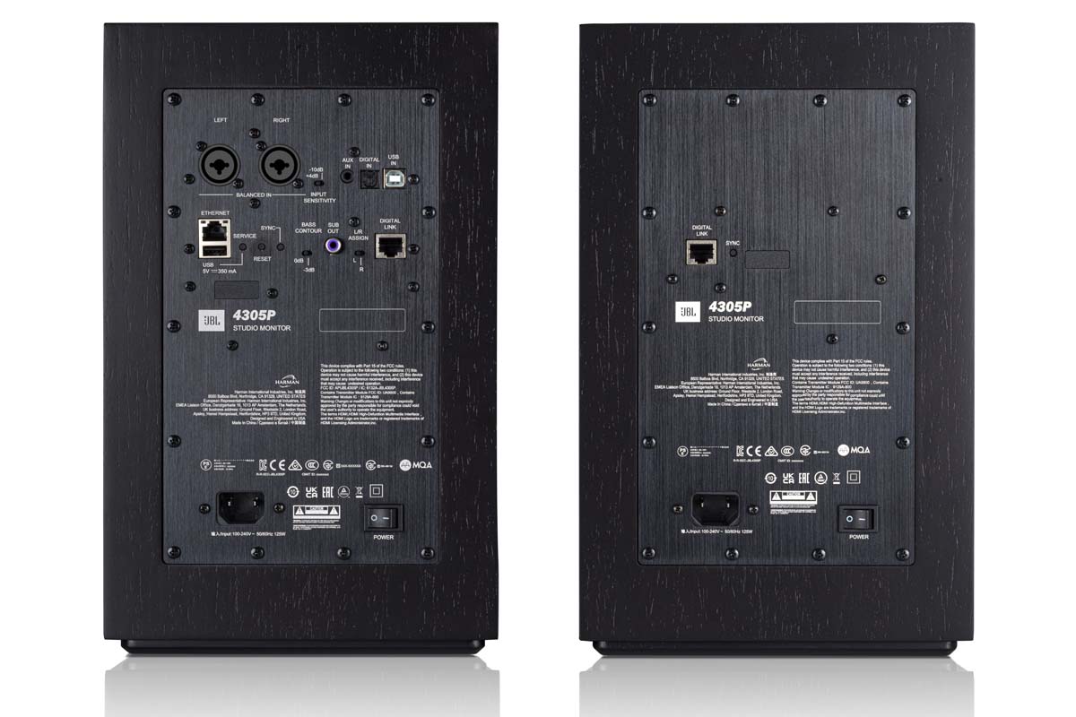 Rückseitig unterscheiden sich die beiden Monitore deutlich, gibt es doch einen Hauptlautsprecher und einen Sklaven, der mittels eines CAT-Kabels verbunden wird. Per Funk geht es auch, allerdings sinken dann die Datenraten, und so haben wir uns entschieden, bei den Kabeln zu bleiben. Denn die JBL soll sich ja bestmöglich präsentieren können.
