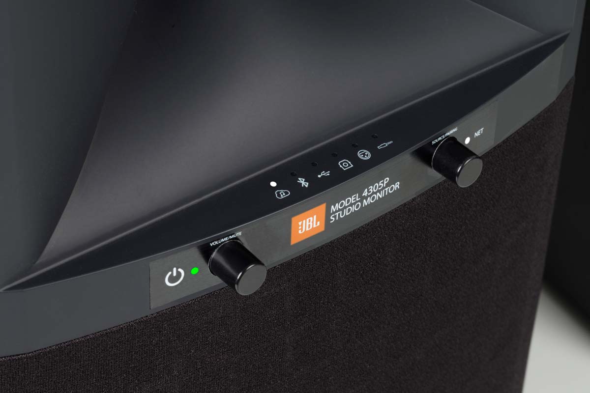 Bei genauerer Betrachtung halten die kleinen 4305P tatsächlich, was ihre blaue Front verspricht. Ein einzölliger Druckkammertreiber lauert hinter dem klassisch geformten Hornmund, der zwangsläufig etwas kleinere Tiefmitteltöner besteht natürlich aus Papier, und die eingeprägten Ringe zur Versteifung dürfen natürlich auf nicht fehlen. So weit, so gut. Im Innern der Box tummelt sich in hoher Packungsdichte alles an aktueller Technologie, was der Harman-Konzern zu bieten hat, und sorgt gleich zu Beginn der Durchsicht für große Freude: Oft handelt es sich bei solchen Aktivlautsprechern in Wahrheit um passive Konstruktionen, bei denen ein interner Monoverstärker eine passive Weiche ansteuert. Sieht von außen aktiv aus, ist es aber nicht. Hier hingegen kümmern sich zwei eigens konfigurierte Class-D-Verstärker um die beiden Chassis und werden von einem DSP als Weiche beschickt. Die Trennfrequenz von guten 1700 Hertz lässt neugierig werden, wie gut die kleine JBL denn mit Stimmen umzugehen vermag.