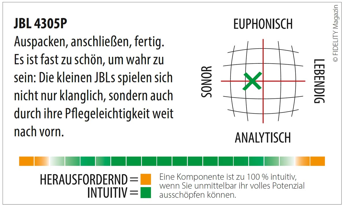 Auspacken, anschließen, fertig. Es ist fast zu schön, um wahr zu sein: Die kleinen JBL 4305P spielen sich nicht nur klanglich, sondern auch durch ihre Pflegeleichtigkeit weit nach vorn.