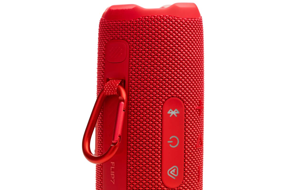 Für den mobilen Einsatz hat der Hersteller seinen akkubetriebenen Aktivlautsprecher mit einer abnehmbaren Trageschlaufe versehen. Alternativ kann man einen Karabinerhaken verwenden, der sich fest am integrierten Clip einrasten lässt – praktisch für Rucksack, Fahrrad oder Strandtasche. Auf eine eigene Tasche verzichtet JBL, was bei diesem Modell absolut zu verschmerzen ist: Das Gehäuse ist stoßfest, wasserdicht und nahezu unverwüstlich. Der JBL Flip 7 vermittelt schon beim ersten Anfassen das Gefühl, dass ihm so schnell nichts etwas anhaben kann.