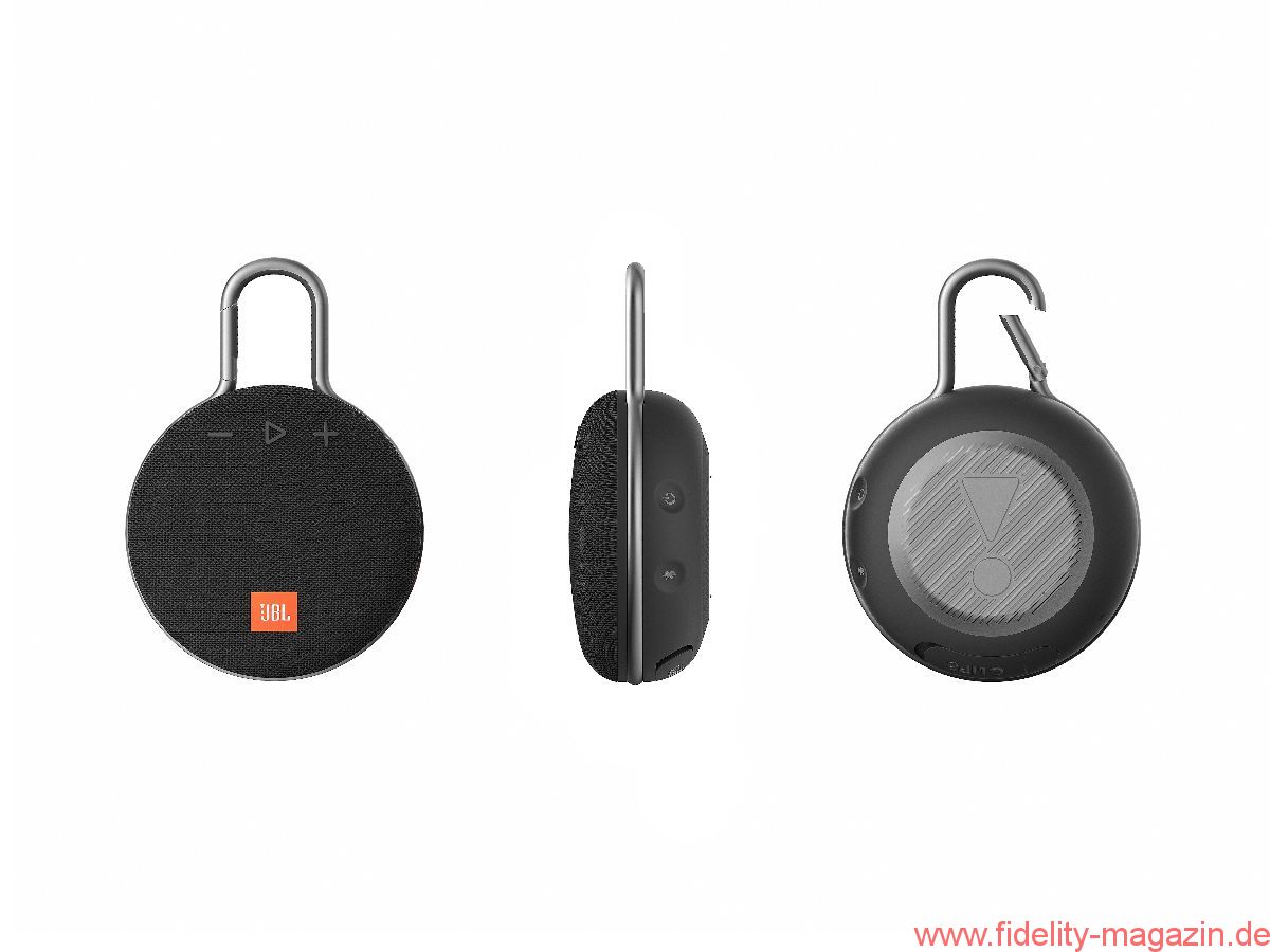 Der JBL Clip 3 präsentiert sich in neuem Design mit farbenfrohen, neuen Materialien und verbesserter Haltbarkeit. Die veränderte Form nimmt den legendären Karabiner wieder auf, jedoch wird diesmal der gesamte Lautsprecher davon umrahmt und dient als Stoßfänger. Die Innenseite des Karabiners besitzt jetzt als besonderes Attribut eine Gummierung im JBL-Muster, wodurch der Lautsprecher selbst an glatten Flächen Halt findet.
