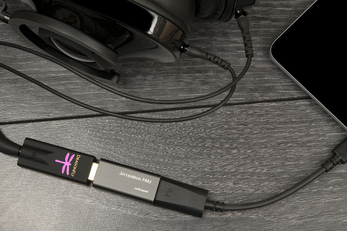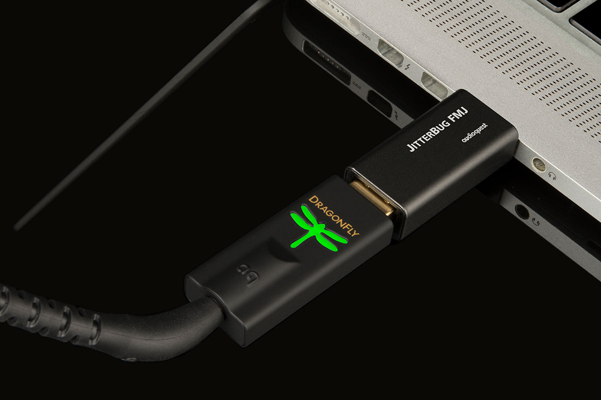 Ein JitterBug in Reihe mit beispielsweise DragonFlys Black oder Red hilft diesen wunderbaren Flugtieren, noch höher und schneller zu fliegen. Es ist jedoch ratsam zu experimentieren. Wenn Sie etwa einen JitterBug vor einen DragonFly Cobalt schalten, der seinerseits einen Teil der JitterBug-Filterung einsetzt, kann sich die Wirkung des JitterBug FMJ je nach Umgebung positiv oder negativ auswirken. Unabhängig vom DragonFly oder anderen Verbrauchern bewirkt ein zweiter JitterBug im Parallelbetrieb praktisch immer eine Verbesserung. Durch seine Wirkung zieht er HF-Rauschen aus der USB-Stromversorgung ab. Dadurch bewirkt der Bug auch Verbesserungen, wenn man ihn an den (für die Wiedergabe eigentlich irrelevanten) Service- oder Update-USB-Port eines Streamers anschließt.