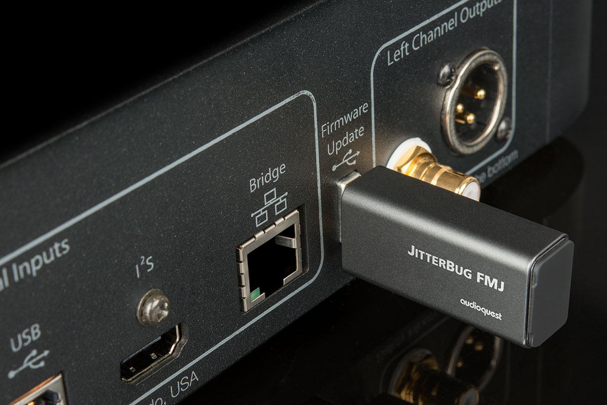Das neue Gehäuse ist nur auffälligste Veränderung, aber auch das scheinbar harmlose, aufklappbare “Gummiteil”, das den Ausgang des JitterBug FMJ abdeckt, ist entscheidend für die verbesserte Leistung des kleinen Käfers. Diese “Tür” schirmt HF ab, da das Material aus stark HF-absorbierendem Kohlenstoff besteht. Verwenden Sie einen JitterBug zwischen einem beliebigen Computer, Smartphone, NAS, Streamer oder Car-Audio-System und einem USB-Anschluss. Für zusätzliche Klangverbesserung kann man den JitterBug überdies an unbelegten USB-Ports als Abschlussstecker einsetzten.