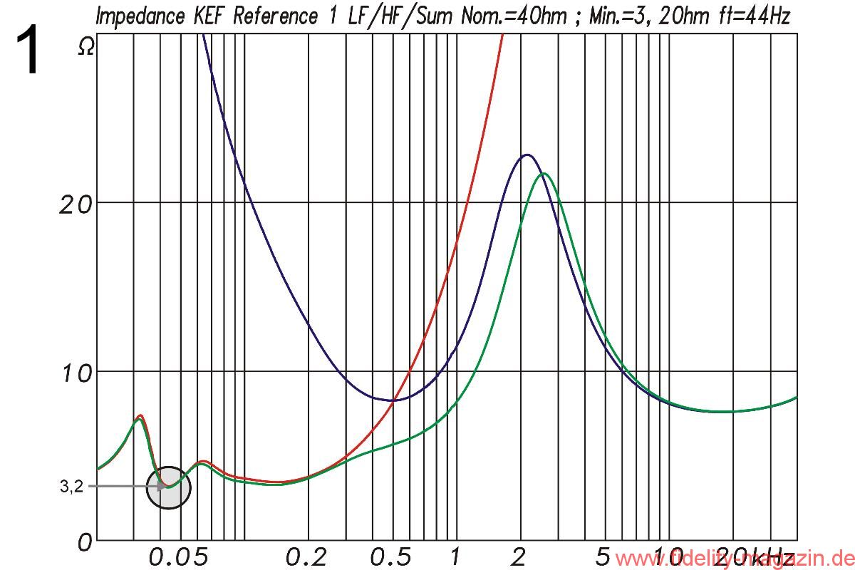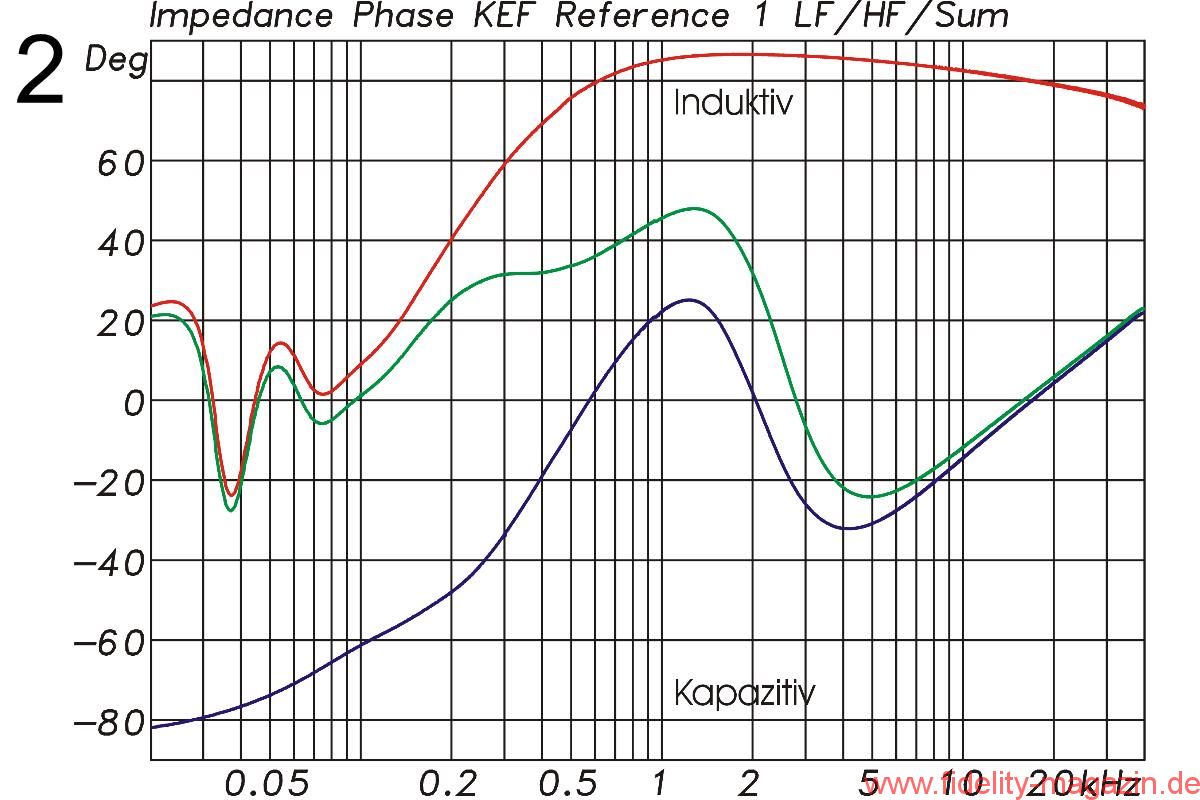 Abb. 1 und 2 zeigen dazu zunächst die Verläufe der elektrischen Impedanz in Betrag und Phase. Sehr gut ist hier zu erkennen, wie für den Tieftonweg (rot) mit Tiefpassfilter im Signalweg der Betrag der Impedanz zu den hohen Frequenzen hin ansteigt und sich die Phase schnell dem Wert von +90° nähert. Letzteres bedeutet eine rein induktive Last, die durch die Serienspule im Tiefpassfilter bei hohen Frequenzen entsteht. Komplementär dazu verhält sich der Mittelhochtonzweig (blau) mit einem Hochpassfilter, wo eine Serienkapazität die Impedanz zu den tiefen Frequenzen hin ansteigen lässt, um dann auf einen Phasenwinkel von –90° hinauszulaufen. Beides zusammen ergibt den Verlauf der Box als Ganzes (grün), wo sich ein Impedanzminimum von 3,2 Ω bei 44 Hz erkennen lässt und eine Abstimmung des Bassreflexgehäuses auf 44 Hz. Im Datenblatt wird zwar das Impedanzminimum mit 3,2 Ω korrekt genannt, die Reference 1 aber trotzdem als 8-Ω-Box bezeichnet, was nicht ganz verständlich ist.