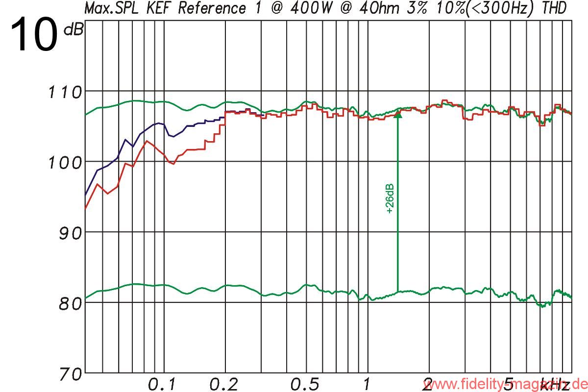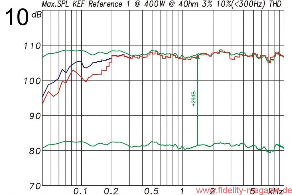 Gemeinhin ist diese Art Messung ein sehr schwerer Prüfstein für HiFi-Lautsprecher, wenn nicht sogar ein echtes Killer-Kriterium, wo sich jede Schwäche offenbart. Nicht so bei der KEF Reference 1, die hier mit höchster Perfektion spielt, die 400 W Leistung der Sinusbursts locker wegsteckt und bei nicht mehr als 3% Verzerrungen souverän in adäquaten Schalldruck umsetzt. Erst unterhalb von 200 Hz fällt die Kurve dann leicht ab und die Verzerrungen nehmen zu, was jedoch nicht verwundert, da hier ein einzelnes 160-mm-Chassis einfach an seine Grenzen stößt.