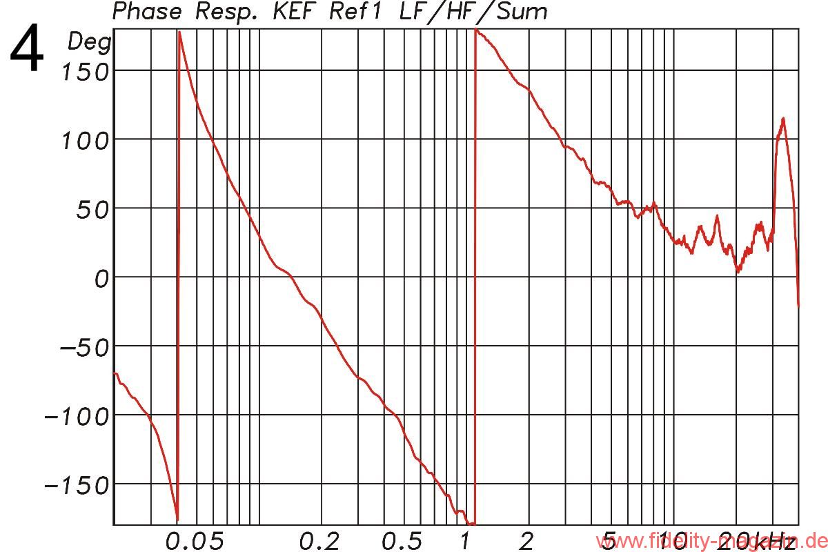Die Reference 1 ist als 3-Wege-System mit passiver Weiche aufgebaut. Die Trennungen erfolgen bei 350 Hz und 2,8 kHz. Auch zum Thema Frequenzweichen hat man sich bei KEF viele Gedanken gemacht. Die Weichenbauteile wurden dazu zunächst auf ihr Verzerrungsverhalten hin getestet, wobei es zu einigen überraschenden Ergebnissen kam, die verständlicherweise nicht näher erläutert werden. Die daraus aufgebauten Filter sind 1. und 2. Ordnung, da man die Phasendrehungen so gering wie möglich halten möchte. Zusammen mit den Filterfunktionen der Lautsprecher selber ergeben sich dann zwei Übergänge jeweils 2. Ordnung und somit in der Summe 360° Phasendrehung. Hinzu kommen 360° am unteren Ende des Frequenzbereiches durch die Hochpassfunktion 4. Ordnung des Bassreflexgehäuses (siehe Abb. 4). Weitere Aspekte, die für den Entwurf der Filter relevant waren, sind das Abwägen einer Impedanzkorrektur einerseits der Treiber, zum anderen eine Über-alles-Kompensation für den Impedanzverlauf der Box im Ganzen. Beides bringt Vorteile mit sich: Die Filterfunktionen werden genauer abgebildet, wenn die Impedanzschwankungen der Treiber ausgeglichen werden, und der Verstärker sieht eine angenehmere Last, wenn ausgeprägte kapazitive und induktive Anteile kompensiert werden. Andererseits verursachen mehr Bauteile aber auch mehr nichtlineare Verzerrungen; es gilt also, einen optimalen Mittelweg zu finden.