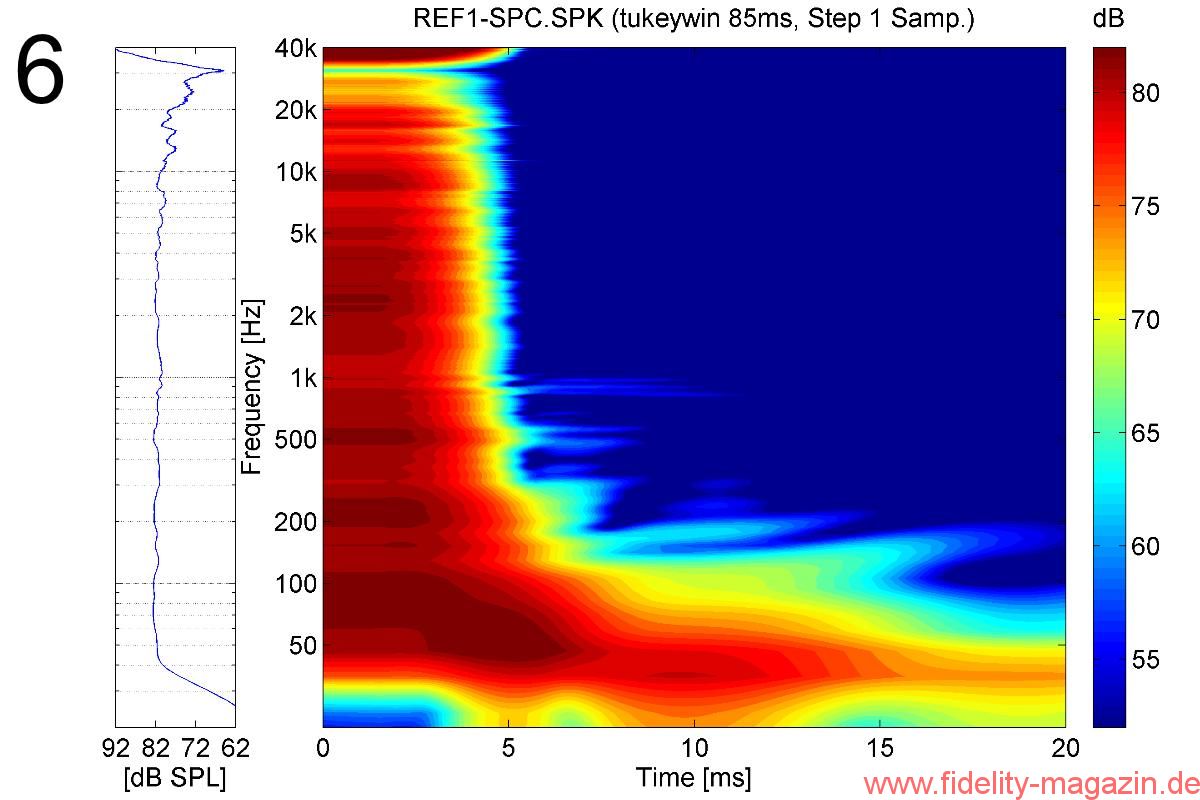 Im Spektrogramm aus Abb. 6 zeigt sich das Ausschwingverhalten der Reference 1 in fast perfekter Form. Die wenigen kaum sichtbaren kleinen Resonanzen bedürfen kaum der Erwähnung und könnten durch Eigenfrequenzen der Gehäusevolumina entstehen. Partialschwingungen der Membranen scheinen für die Mittelhochton-Einheit ein völliges Fremdwort zu sein. Das Uni-Q-Chassis agiert hier völlig makellos.
