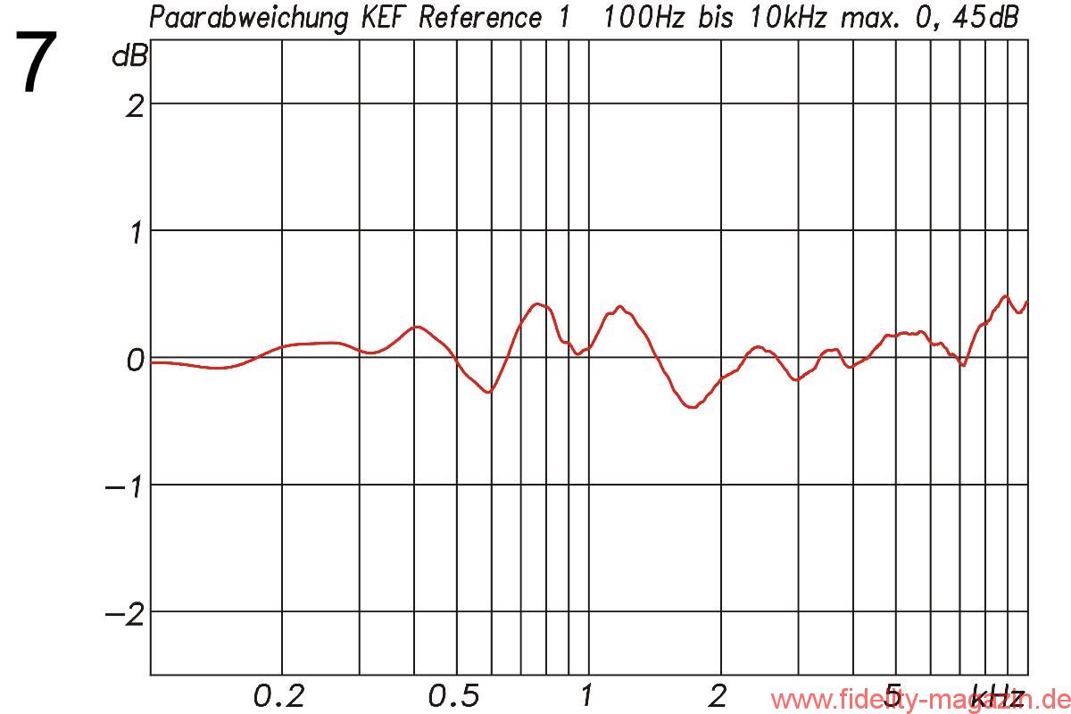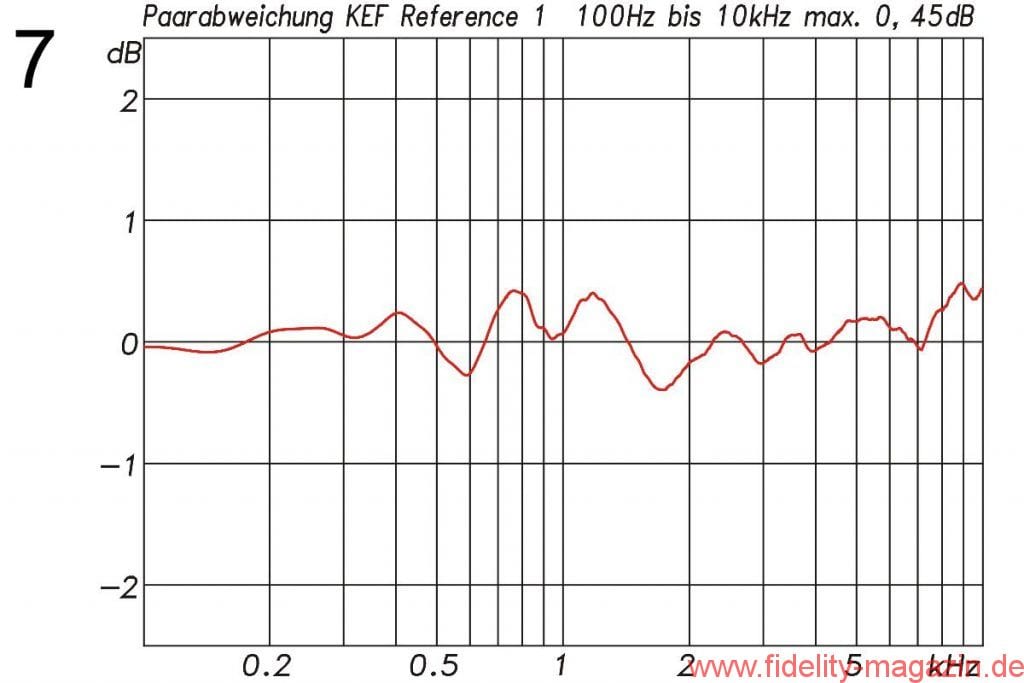 Eine Qualitätskontrolle auf höchstem Niveau und geringste Abweichungen der Lautsprecher untereinander gehören bei KEF seit jeher zum guten Ton. Wir haben es uns daher nicht nehmen lassen, auch die beiden Testexemplare auf die Paarabweichung hin zu untersuchen. Ob sich daraus eine allgemeine Aussage herleiten lässt, ist schwierig zu beurteilen, da Testexemplare meist schon durch viele Hände gereicht wurden und man nicht unbedingt weiß, was die Lautsprecher dabei schon alles erleiden mussten. Trotzdem fällt das Ergebnis für die Paarabweichung mit einem Höchstwert von 0,45 dB sehr gut aus. Abb. 7 stellt die zugehörige Kurve dar. Gezeigt wird die Abweichung der Frequenzgänge zwischen 100 Hz und 10 kHz mit 1/3-Oktav-Glättung.
