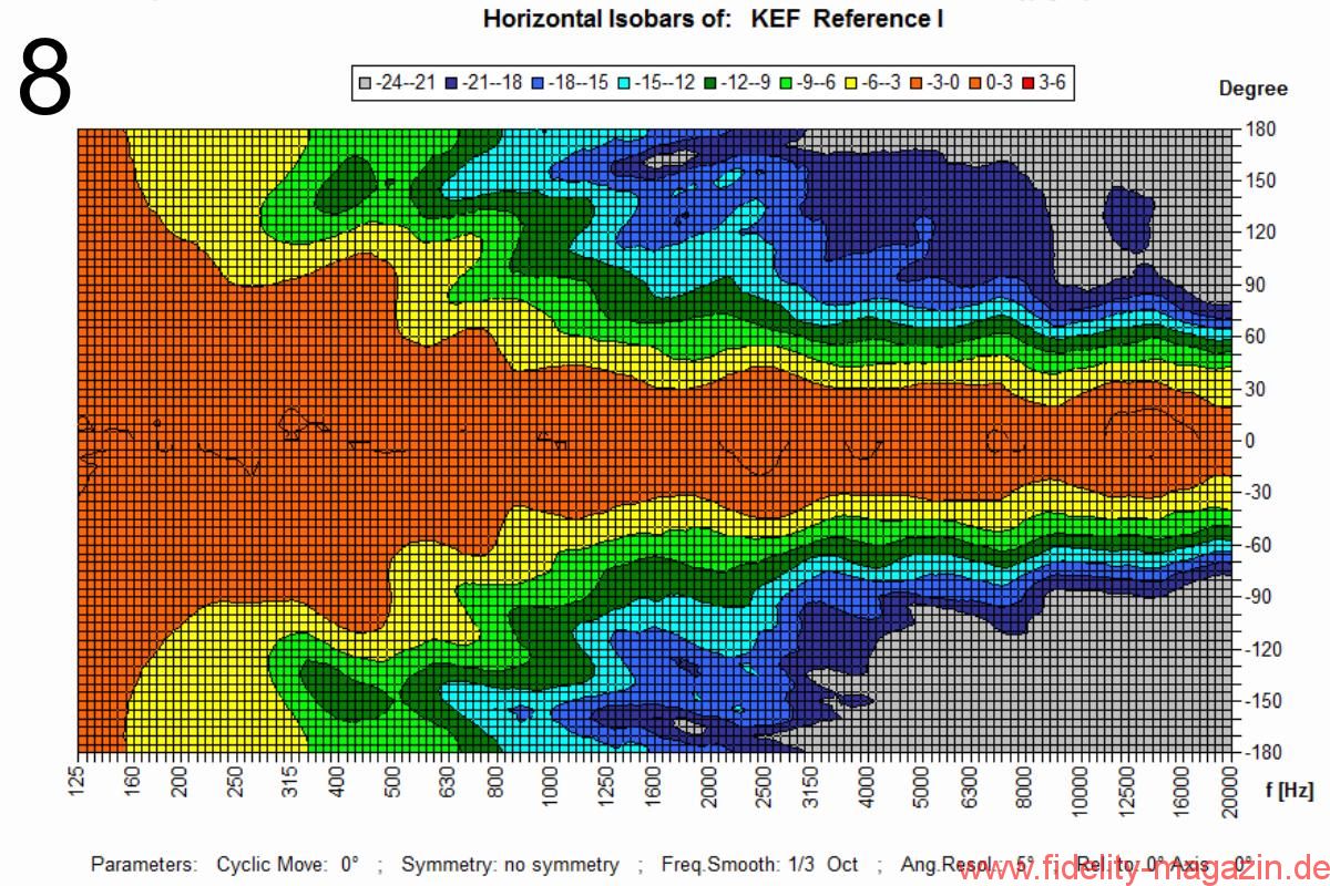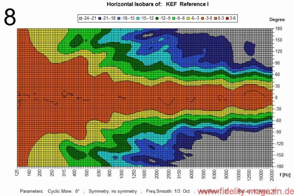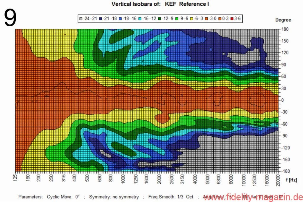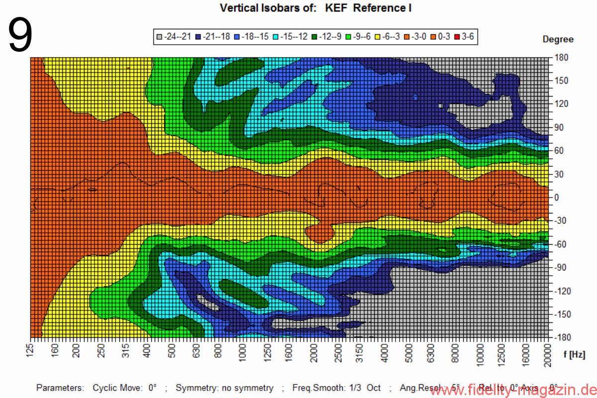 Abb. 8 und Abb. 9 stellen das Abstrahlverhalten der Reference 1 für die horizontale und vertikale Ebene in Isobarenform dar. Mit einem mittleren Öffnungswinkel von 100° in beiden Ebenen oberhalb von 1 kHz gibt sich die Reference praxistauglich für normale Abhörsituationen. So weit noch nicht Ungewöhnliches. Beeindruckend fällt jedoch die Gleichmäßigkeit der Isobaren für beide Ebenen aus. Die Schwankungsbreite liegt gerade einmal bei 12° für die Horizontale und bei 15° für die Vertikale. Die kleinen Unregelmäßigkeiten in der Vertikalen sind dem hier nicht symmetrischen Aufbau geschuldet, können aber getrost vernachlässigt werden. Ein solches Resultat, mit fast perfekt konstanten Isobarenkurven, lässt sich nur mit einem sehr gut konstruierten koaxialen Chassis wie dem Uni-Q erzielen.