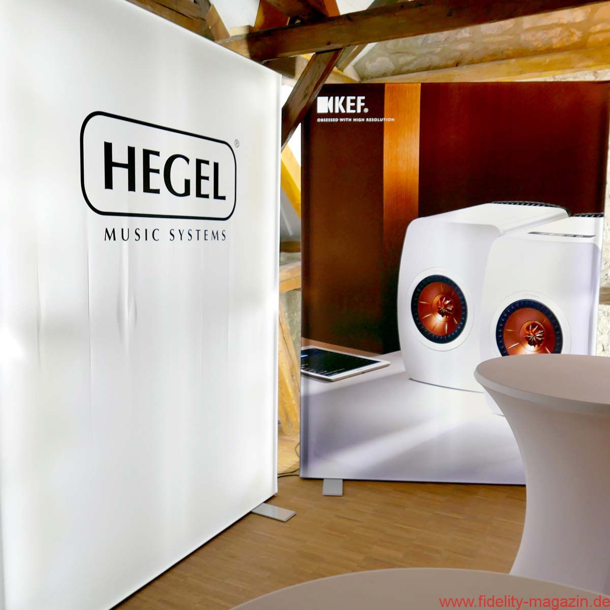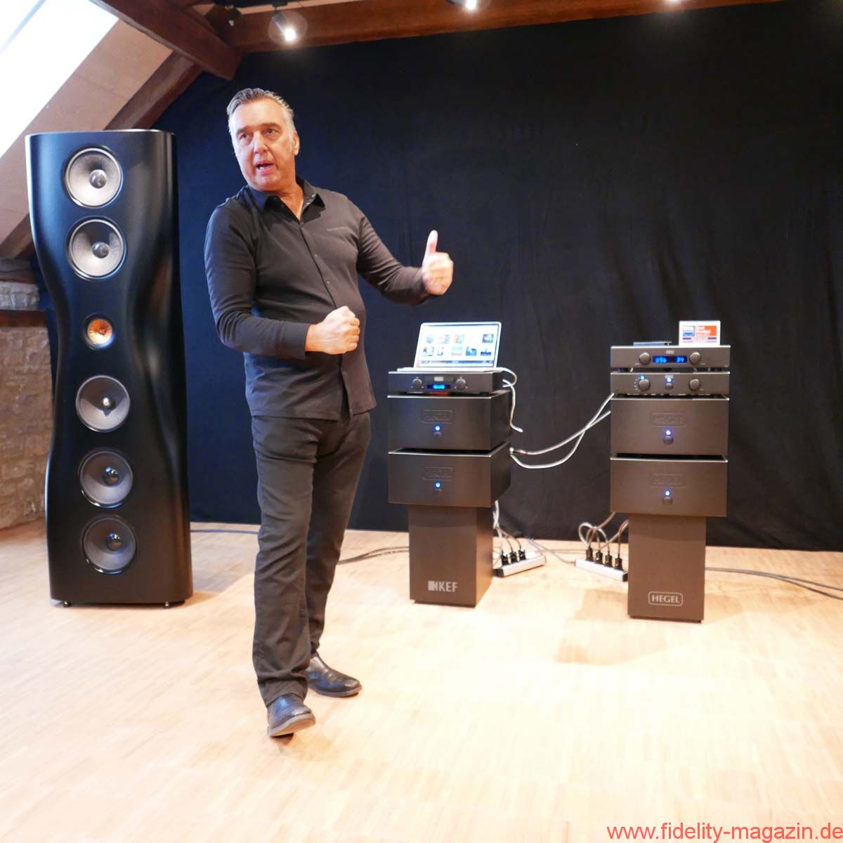 Festhalten: zwei riesige mattschwarze KEF Muon – powered by Hegel! Ein Erlebnis der Extraklasse auf Gut Wöllried bei Würzburg.