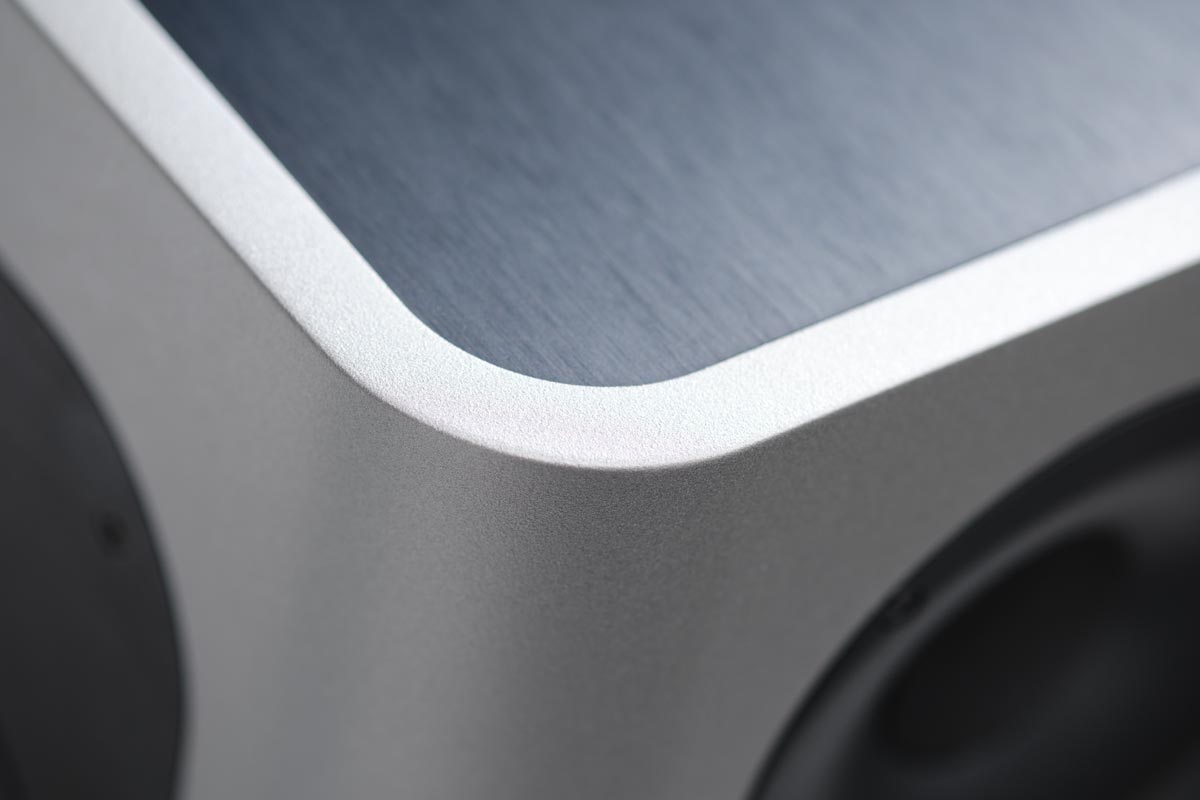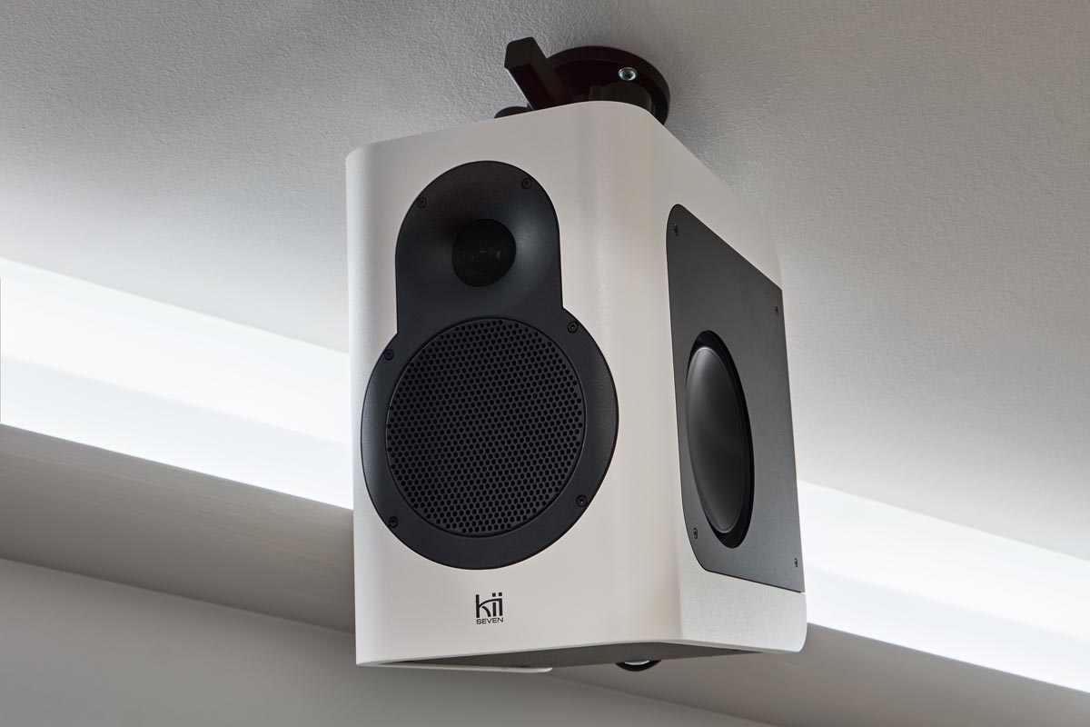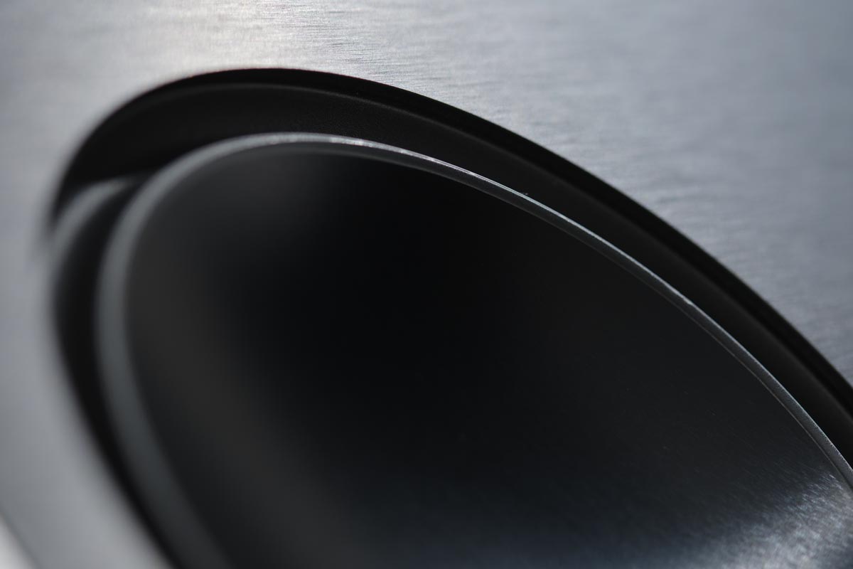 Noch wichtiger ist eine Technologie, die Kii vor rund einer Dekade mit der größeren Three einführte: Kardioid-Abstrahlung. Die eigentliche Schallerzeugung erfolgt über ein Zweiwege-Gespann an der Front des Lautsprechers. Die Entwickler schnürten Hoch- und Tief-/Mittelton in einen gemeinsamen Rahmen und brachten sie räumlich so eng zusammen, dass die SEVEN selbst im Nahfeldbereich den Eindruck einer harmonischen Einpunkt-Schallquelle erzeugt. Bei den seitlich verbauten Membranen handelt es sich um Tieftöner, die phaseninvertiert arbeiten. Während sich Mitten und Höhen vergleichsweise gerichtet von den Treibern lösen, werden Bässe bekanntermaßen kugelförmig vom Lautsprecher abgestrahlt. Und genau das unterbinden die beiden zusätzlichen Chassis: Durch die Invertierung löschen sie einen Großteil des seitlichen und fast den gesamten rückwärtigen Bass aus. Reflexionen und Raumbezüge spielen für die SEVEN deshalb nahezu keine Rolle. Kardioid heißt die Technik übrigens, weil die daraus resultierende Abstrahlcharakteristik in der Draufsicht wie ein Herzchen aussieht.