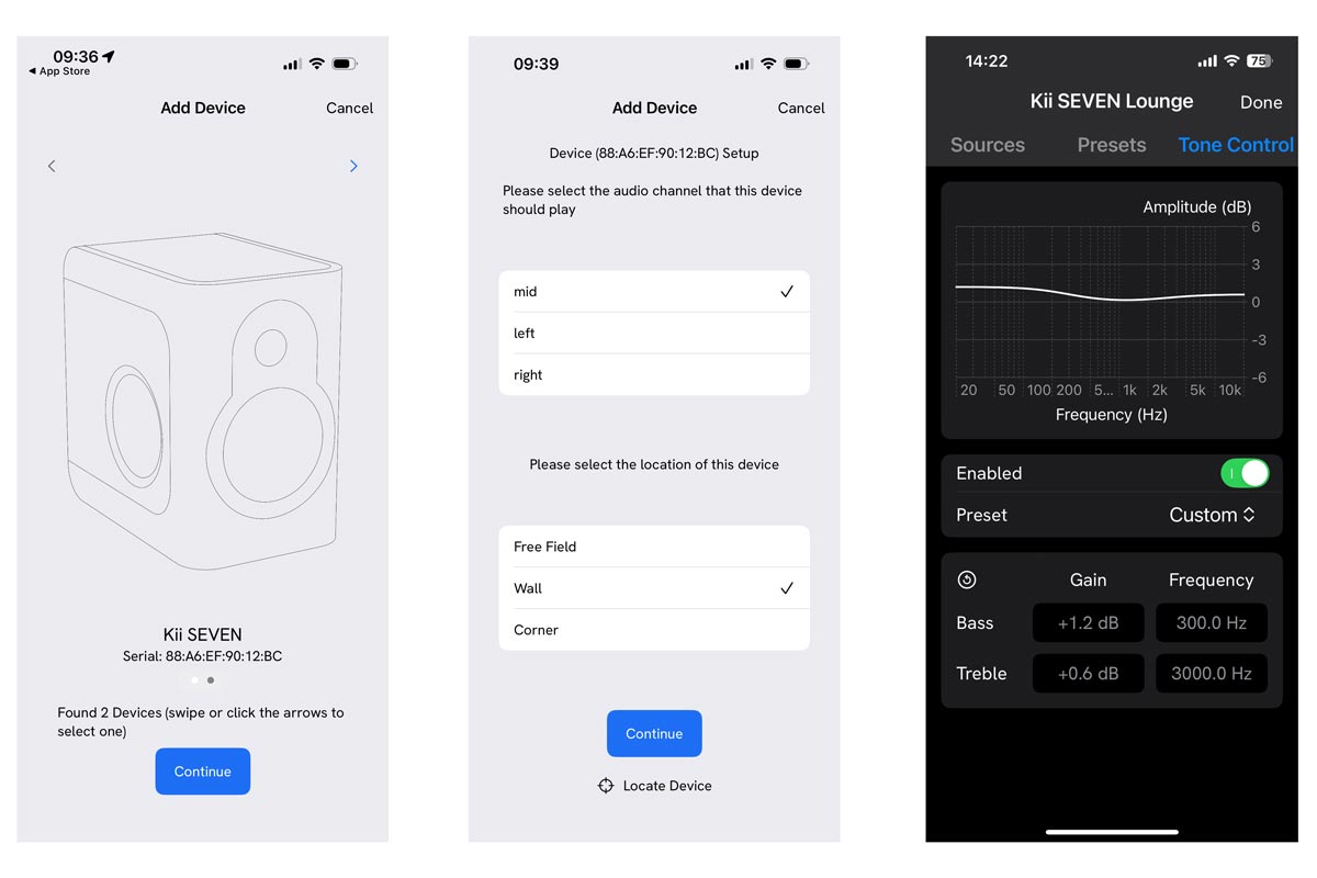 Zwingend erforderlich sind die physischen Anschlüsse nicht, da auch Bluetooth und WiFi an Bord sind. Noch bevor man die SEVEN erstmals in Betrieb nimmt, sollte man die “Kii Home”-App des Herstellers auf das Smartphone oder Tablet herunterladen. Nur Augenblicke nach dem Einschalten melden sich die beiden Neuzugänge in der App. Man kann ihnen das WLAN-Passwort verraten und eine Funktion (linker oder rechter Kanal) zuweisen. Nach etwa drei Minuten – wir mussten wie gewohnt erstmal das Zettelchen mit dem Passwort finden – war die SEVEN schnurlos spielbereit. Die Aktive ist natürlich UPnP-kompatibel, bringt aber auch Schnittstellen für die Connect-Varianten von Spotify, Tidal und Qobuz mit. Vor allem der letztgenannte Webdienst begeisterte uns mit seiner Klarheit und Detailfülle. Gesteuert werden die drei Streaming-Angebote (inklusive Pegel) direkt und unkompliziert über die jeweiligen Apps der Anbieter.