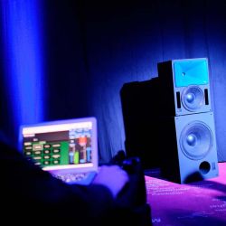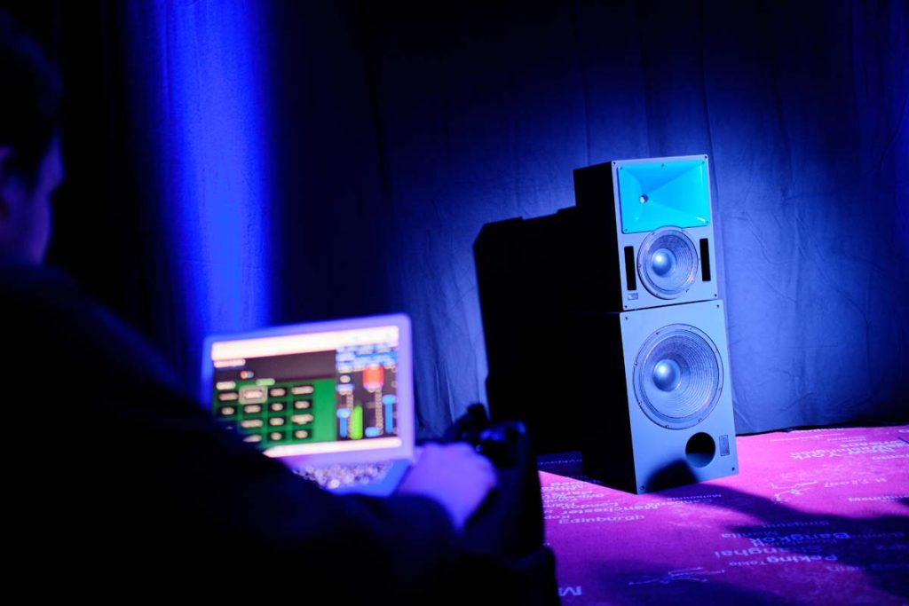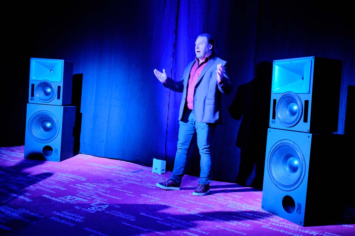 Ein Raum im Erdgeschoss darf natürlich nicht unerwähnt bleiben. Eine Firma, die in unserem Umfeld nahezu unbekannt und die ausschließlich in der professionellen Beschallung zu Ruhm und Ehre gekommen ist. Die Rede ist von Meyer Sound aus den USA. Meyer hat in Wien ihr Bluehorn System präsentiert. Ein großes Monitoring-System, das seinen Ursprung in der Kinobeschallung hat.