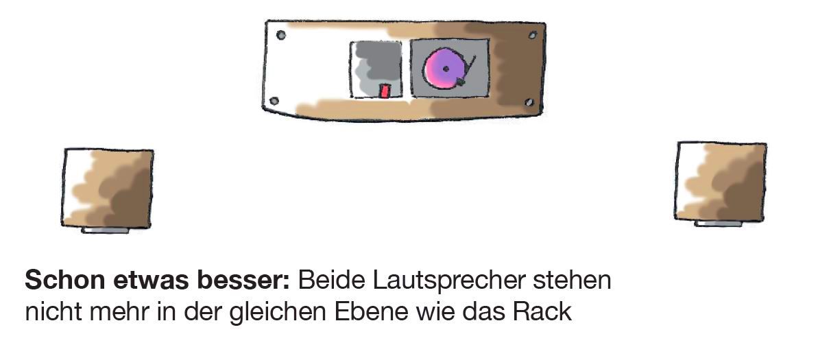 Dabei ist diese Aufstellung schlicht und ergreifend falsch. Am meisten amüsiert mich das Ganze, wenn zwischen zwei Lautsprechern mit seitlichen, nach innen ausgerichteten Tieftönern auch noch ein Plattenspieler thront. Den könnte man dann genauso gut auf einen Subwoofer stellen! Wegen der kugelförmigen Schallausbreitung im Tieftonbereich konzentriert sich zwischen den Lautsprechern kaum weniger Schalldruck als vor der Lautsprecherebene, allerdings nimmt der Schalldruck mit der Entfernung quadratisch ab, die Distanz macht es also aus. „Weg mit dem Rack!“ lautet folglich die Devise, je weiter, desto besser. Außerdem wird die Ausbildung eines virtuellen Schallfelds zwischen den Lautsprechern – die berühmte „Soundstage“ – durch das Musikmöbel und die Gerätschaften selbst gestört, zusätzliche, unnötige Interferenzen verschmieren so die Laufzeit-Informationen, die in der Tonkonserve stecken. Logischerweise sollte zwischen beiden Lautsprechern bestenfalls gar nichts stehen. Und falls die Boxen auch noch den Fußboden anregen – Stichwort: Holzdecken –, sollten wir das Equipment nicht auch noch zusätzlich „durchrütteln“. Dass so mancher Audio-Designer alle Anstrengungen unternimmt, seine Komponenten vor Vibrationen und Luftschall zu schützen, die Geräte dann aber genau zwischen oder neben den Lautsprechern landen, ist ein Treppenwitz der HiFi-Geschichte – allerdings kein guter.