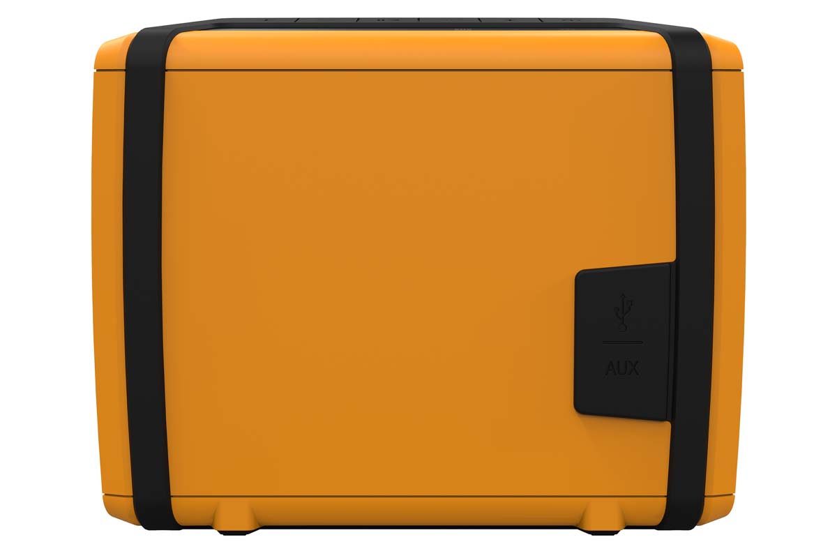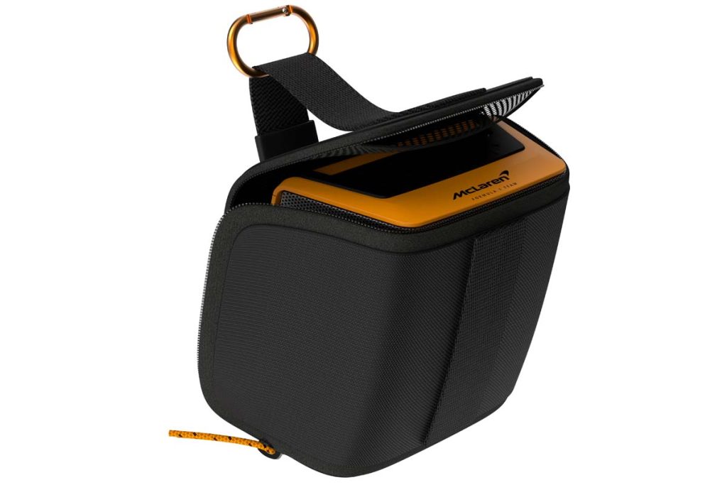 Der Klipsch Groove McLaren Edition trägt unverkennbar das Design des berühmten Rennteams McLaren: Das schwungvolle Logo und die Gehäuselackierung im originalen Papaya-Orange. Das perforierte Metallgitter schützt den Schallwandler dahinter, eine rutschfeste Gummiumrahmung mit integrierten Tasten sorgt für sicheren Stand und problemlose Bedienung in jeder Situation. Das System ist mit Schutzklasse IP56 staubgeschützt wie wasserdicht und nimmt selbst kurzzeitiges Eintauchen problemlos hin. Eine von den McLaren Reifenwärmern aus dem Rennsport inspirierte Hülle mit Reißverschluss schützt den Lautsprecher, wenn er nicht in Verwendung ist.