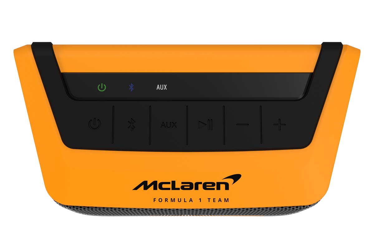 Den Drahtlos-Lautsprecher McLaren Groove gibt es exklusiv in der originalen Optik von McLaren Racing: Schwarz mit Papaya-Orange. Die unverbindliche Preisempfehlung beträgt 199,00 Euro (inklusive 19 Prozent Mehrwertsteuer). Er ist nach Schutzklasse IP56 staubgeschützt und wasserdicht auch gegen Eintauchen.
