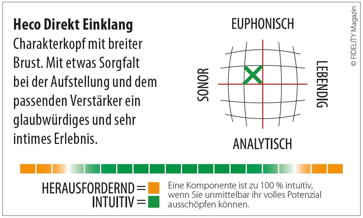 Zunächst war die Heco Direkt Einklang nur für ein kurzes Spotlight vorgemerkt. Doch die Vorstellung im redaktionseigenen Spielzimmer war so überzeugend, dass wir gar nicht anders konnten, als ihr den gebührenden Platz zu widmen. Denn bei der kleinsten Vertreterin aus Hecos ziemlich erfolgreicher Direkt-Linie ist der Name Programm. Musikaffine Zeitgenossen finden hier deutlich leichter zum Einklang mit sich, dem Leben, dem Universum und dem ganzen Rest als durch Rebirthing-Erlebnisse oder Gruppenatmen zur Klangschalenmeditation.
