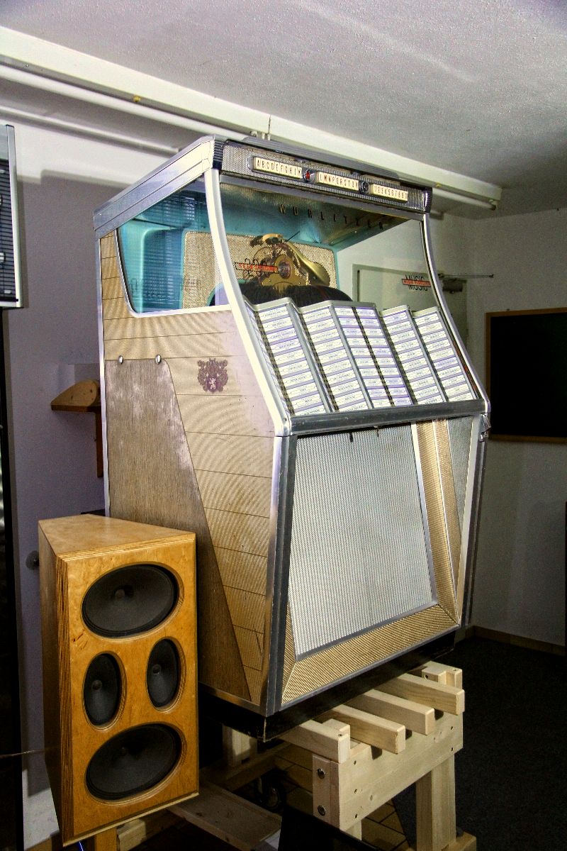 Der Firmenname „Lautsprecher und mehr“ verrät es ja schon, ein weiteres Schild im Eingang spricht explizit von „Retro“: Bei Wolfgang Kühn gibt es definitiv mehr zu entdecken als herkömmliche Lautsprecher. Seine Manufaktur mit angeschlossener Werkstatt baut beispielsweise die markanten Keramikkugeln, die wir in FIDELITY Nr. 14 vorgestellt haben. Damit räubert er zwar schon in der aktuellen und durchaus ambitionierten High-End-Liga, doch mindestens ebenso gern kümmert sich der handwerklich begabte Ex-Manager um röhrenbestückte Klassiker aus der guten Stube, insbesondere um größere „Gebissradios“ von Saba, Nordmende, Loewe oder Nordmende aus den Fünfzigern und Sechzigern, aber auch um Plattenspieler der vorvorletzten Jahrzehnte, etwa von Dual. Den Eingangsbereich dominiert eine ganze Regalwand voller Radios in allen nur denkbaren Zuständen, an der gegenüber liegenden Wand warten diverse Boxenprojekte, ganz offensichtlich bestückt mit den markanten Radiolautsprechern aus der goldenen Ära, auf ihre Abholung oder auch auf eine Demonstration. Ein ganzer Tisch voller Chassis und eine dicke, fette Wurlitzer-Jukebox mit goldenem Tonarm machen sich ebenfalls im Eingangsbereich breit.