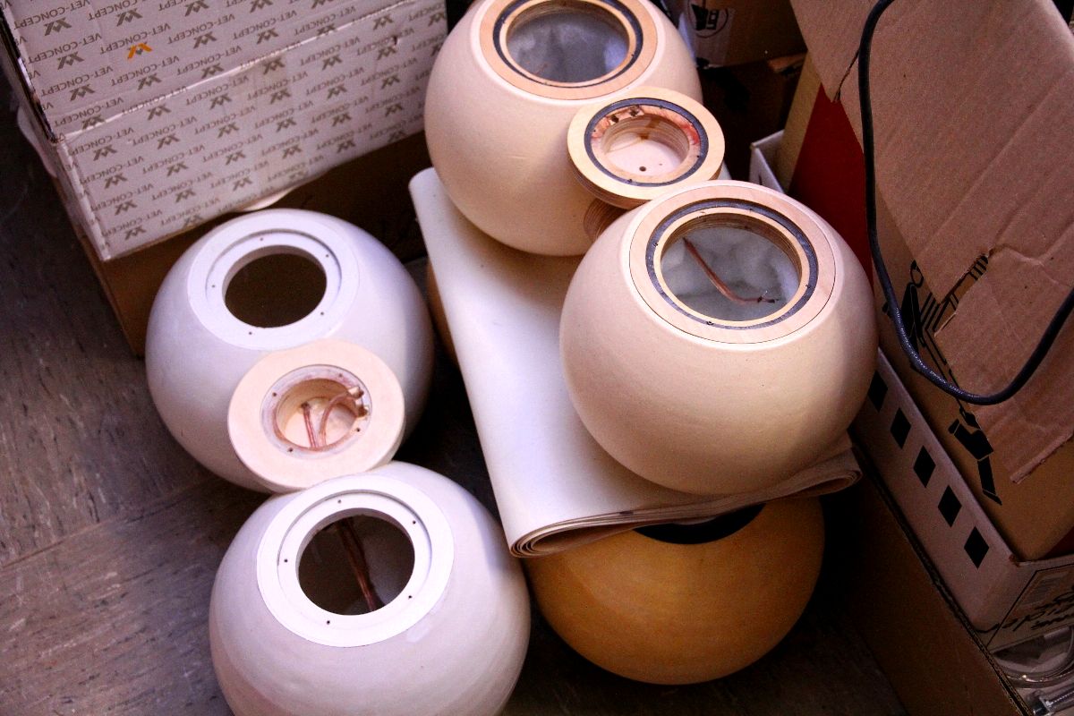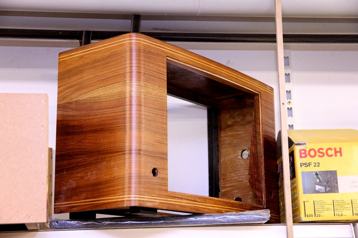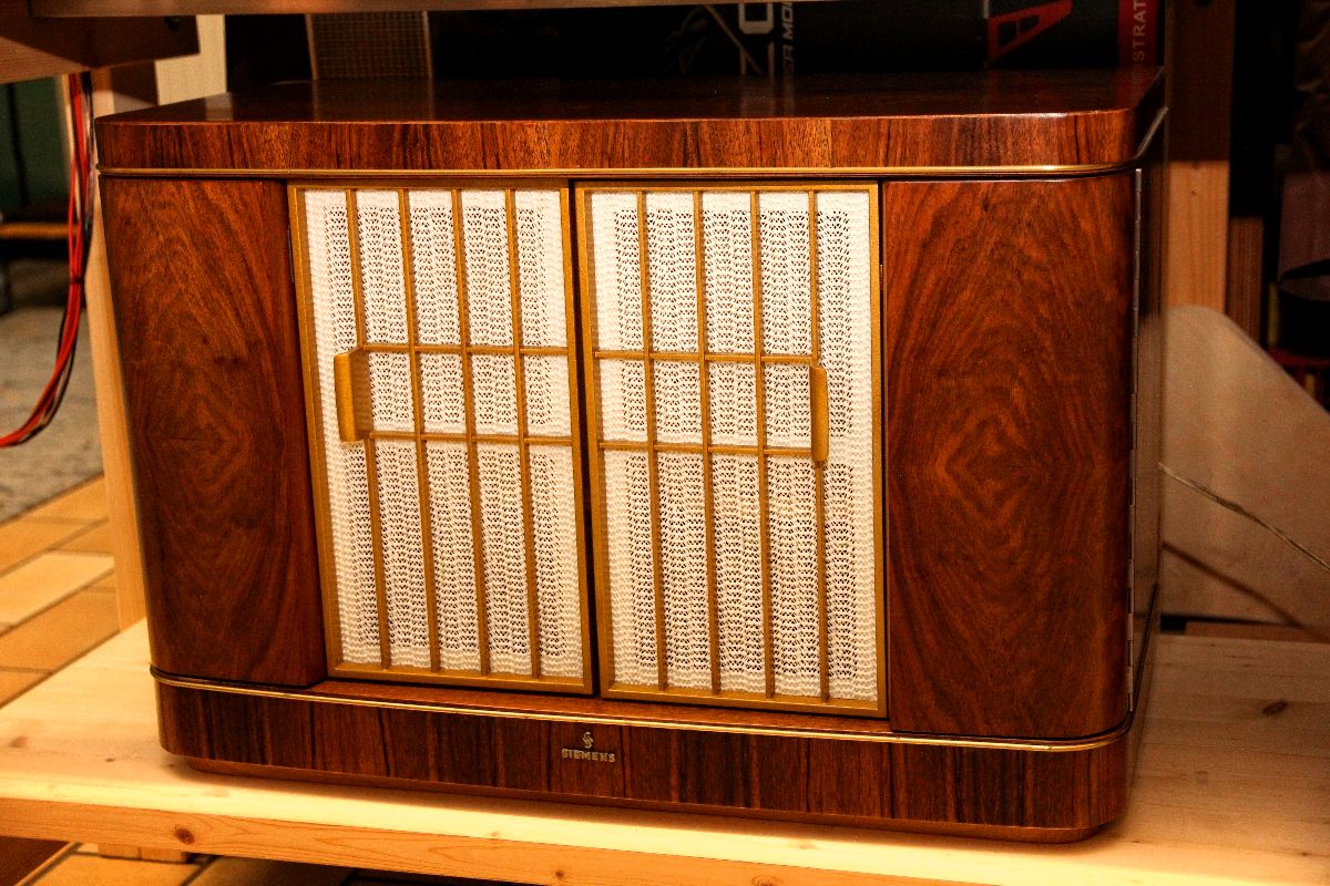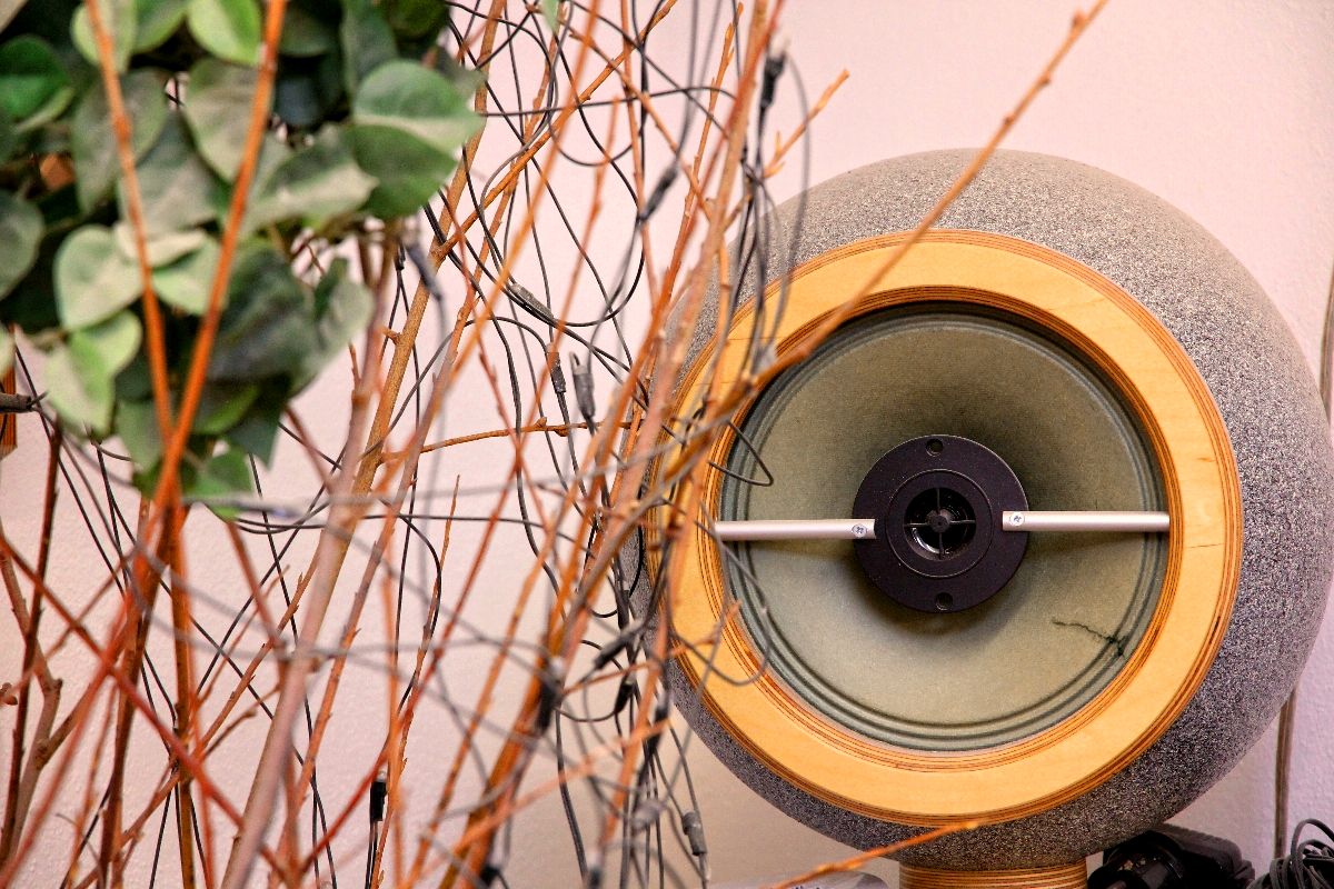 Wer möchte, kann jedes der ausgestellten Radios in tipptopp restaurierem Zustand erwerben, er kann aber auch selbst ein Erb- oder Fundstück zur Auffrischung abgeben. Kühn schreckt dabei übrigens auch nicht davor zurück, eigentlich hoffnungslosen Fällen im Notfall mit modernen Bauteilen oder Erweiterungen auf die Sprünge und damit zu neuem Leben zu verhelfen. Der sonst so gern „heilige“ Originalzustand für Oldtimer-Radios gilt hier keineswegs für jedes Exponat, und für die mitunter witzigen bis waghalsigen Boxen schon gleich zweimal nicht. Wolfgang Kühn weist dann aber explizit und detailliert auf jede (mögliche) Modifikation, auf jede Nicht-Originalität hin, kann sein vermeintlich frevelhaftes Handeln erlären. Bei „Lautsprecher und mehr“ kauft man nicht die Katze im Sack, sondern entweder einen bestens restaurierten Oldtimer oder eine bestimmte Form von Replica. Oder halt ein modernes Satelliten-/Subwoofer-Soundsystem mit Keramikkugeln und neuzeitlichen High-End-Treibern. Oder man gibt gleich ein ganz neues, individuelles Projekt in Auftrag – Hauptsache, es hat im weiteren Sinne noch irgendetwas mit Beschallung zu tun.
