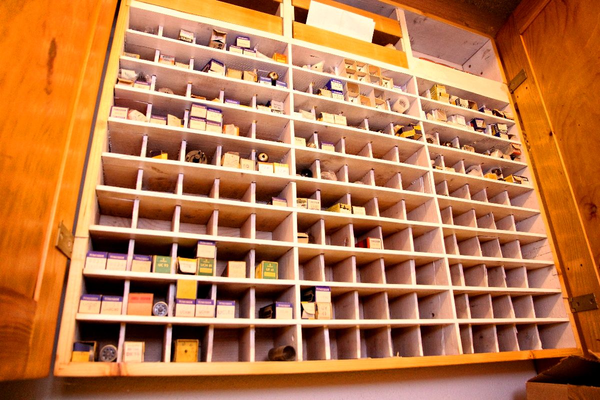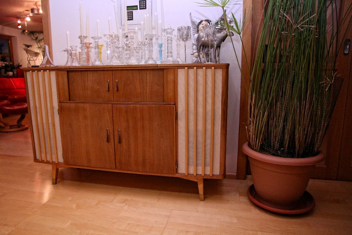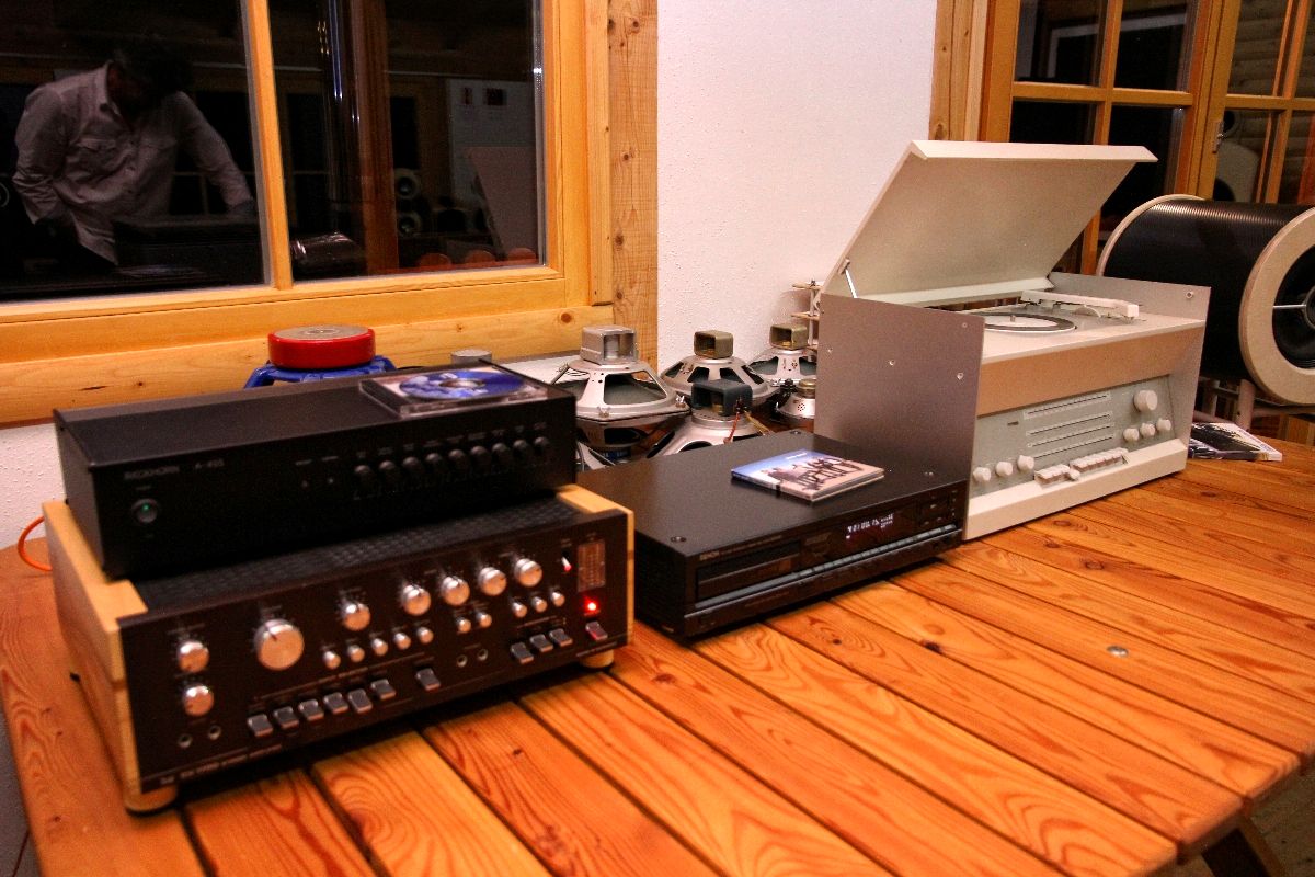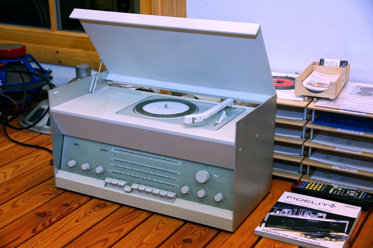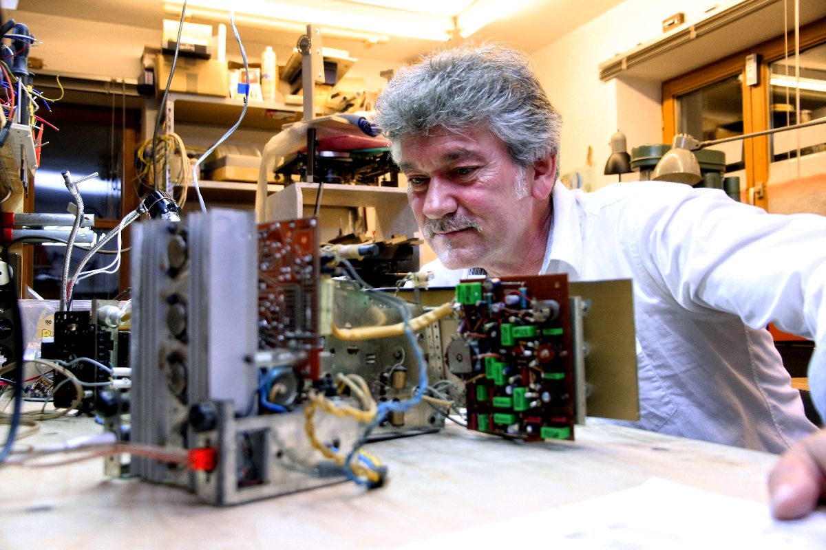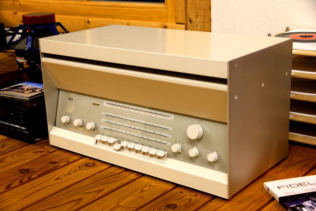In einem der Treppenaufgänge beherbergt Wolfgang Kühn einen Teil seiner beachtlichen Röhrensammlung, in einem anderen geht’s vorbei an Chassis-Paaren aller Art. Dort geht’s auch hinunter in ein weiteres Lager, gespickt mit noch zu restaurierenden Radios und anderen Spezialitäten, aber auch mit Banalitäten, wie sie in jedem Keller dieser Welt zu finden sind. Freudig kramt der Hausherr ein sehr seltenes Paar von Grundig-Koaxialchassis mit elektrostatischen Hochtönern hervor – ein hochinteressantes Thema, das er bisher noch nicht auf dem Werktisch hatte. Dann wieder hinauf in die Holzwerkstatt, vorbei an der Löt- und Schrauberbank, bis wir schließlich im eher rustikal gestalteten Partyraum landen. Dort beweist eine Braun-Komplettanlage in Bestzustand, dass es auch bei Gerätschaften, die schon mehr als ein halbes Jahrhundert auf dem Buckel haben, nicht immer Holzfurnier und Braun und Messing sein muss. Danke, Dieter Rams!