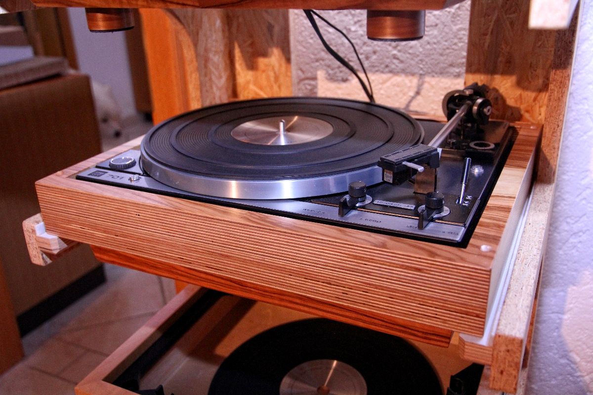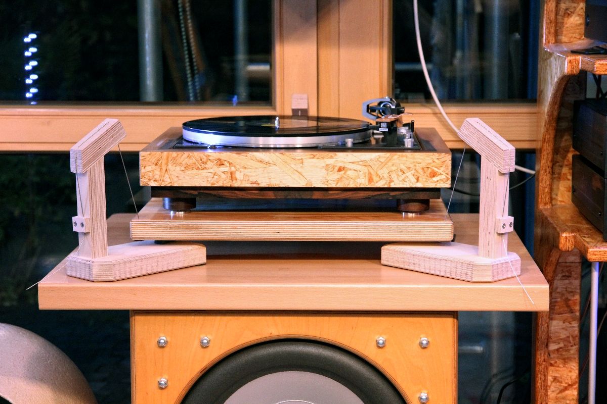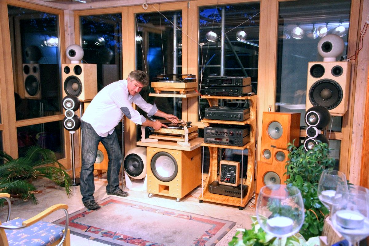 Woher kommt diese Vielfältigkeit, dieses Sich-nicht-festlegen-wollen? Nun, Wolfgang Kühn hatte nach einer klassischen Industriekarriere als Mikroprozessorspezialist bei einem Großkonzern einfach keine Lust mehr auf strenge Regeln und festgefügte Schemata. Vor ein paar Jahren sagte er Weltenbummlerei und hierarchischen Strukturen goodbye und gründete kurzerhand seine eigene, kleine Firma, in der er sich fortan nur noch um das kümmern wollte, was ihm selbst auch Spaß macht. Was ganz nebenbei auch zu interessanten Lichtspiele(reie)n geführt hat: Überall im Haus sind eigene LED-Konstruktionen installiert, von der Werkstattbeleuchtung über bewegungsmeldergesteuerte Außenlampen bis hin zu Kronleuchter-Derivaten mit einer steuerbaren Mixtur aus Warm- und Kaltlichtanteilen. Passend dazu dient ein ziemlich ausladendes Musikmöbel, eine Klangkommode von Blaupunkt mit Schiebetüren, eingebauter Tonbandmaschine und Plattenspieler, als Kerzenständerpräsentationsfläche. Und unser Tour Guide erläutert gern und ausführlich … Und schon geht’s wieder um die nächste Ecke, durch den nächsten Raum, die nächste Treppe hinauf und wieder hinunter. Hier, im zweiten Haus des Grundstücks, dem von der Werkbank im Keller bis zur Party-Zone unterm Dach voll funktionsfähigen „Schau-Haus“, finden sich die allermeisten Entwicklungen (und Kuriositäten) aus Kühns Werkstatt. In der Küche sorgen kleinere Keramikkugeln, von einem Transistor-Youngtimer-Amp angetrieben, für satten Sound beim Kaffeekochen. Im Wohnzimmer sind ein halbes Dutzend aufgemöbelter Plattenspieler in einem selbstgebauten Vertikalregal sorgfältig und separat aufgeschichtet. Im Wintergarten wiederum warten ein massiver Subwoofer und ein hängend gelagerter Dual-Klassiker mit neuer Zarge und Edelholz-Headshell nur darauf, ein bleibendes HiFi-Erlebnis auch mal „ganz anders“ zu erzeugen. Und ja, ein Pärchen Breitbandlautsprecher mit „drehenden Hüften“ gehört heute dazu.
