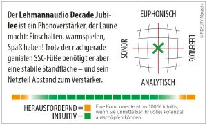 Der Lehmannaudio Decade Jubilee ist ein Phonoverstärker, der Laune macht. Trotz seiner nachgerade genialen SSC-Füße sollte man dem Gerätchen eine stabile Standfläche gönnen und das Netzteil auf Abstand zum eigentlichen Verstärker stellen. Ansonsten gilt: einschalten, warmspielen, Spaß haben!