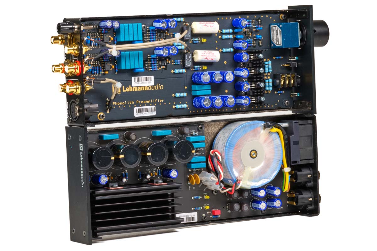 Der Phonolith ist eine Neuentwicklung und irgendwie doch nicht. Er besteht aus einer Kombination der hauseigenen Modelle, der Phonostufe Decade und dem (Kopfhörer-)Vorverstärker Linear II. Unter technischen Aspekten eine sinnvolle Zusammenlegung, spart man so doch einige Bauteilgruppen, verringert die Signalwege und verzichtet auf zusätzliche Kabelanschlüsse – und dadurch auf Übergangsstellen. Dennoch ist bei der Entwicklung des Kombinationsverstärkers alles andere als ein Sparkurs angesagt gewesen. Das beginnt zunächst beim Netzteil PWX II LZ, das nicht dem Decade, sondern dem höherpreisigen Decade Jubilee entstammt, zwei Geräte speist und in wesentlichen Punkten modifiziert wurde. So kann es gegenüber dem Decade-Netzteil mit einer doppelten Siebkapazität punkten, während die Brummfreiheit durch eine höhere Mu-Metall-Schirmung verbessert wurde. Sowohl im Netzteil als auch in der Vorstufensektion finden Mundorf-Elkos Verwendung, und zur händischen Regulierung der Lautstärke wird das butterweich laufende Big Blue, das legendäre blaue Alps-Potentiometer, verwendet. Das alles findet sich jeweils auf einer mustergültig sauber aufgebauten und stringent geordneten Platine wieder. Oder um es metaphorisch auszudrücken: kein Gramm zu viel, kein Gramm zu wenig. Die verwendeten Eingangsstufen orientieren sich an professioneller Studiotechnik wie Mikrofonvorverstärkern. Interessant ist gegenüber dem bisherigen Decade die Neuausrichtung der Abschlusswiderstände für MC-Systeme beim Phonolith. Die Wahl der Abschlussimpedanz wird durch einen zusätzlichen Widerstand von 390 Ohm neben den Standardwerten von 7 Kiloohm, 1 Kiloohm und 100 Ohm noch vielseitiger. Insbesondere Besitzer von Hanna- oder Excalibur-MCs werden dies zu schätzen wissen. Und im Fall der Fälle genügt ein Anruf bei Lehmannaudio – die benötigte Wunschimpedanz erhält man ohne Zuzahlung custom-made. Das nenne ich einen After-Sales-Service!