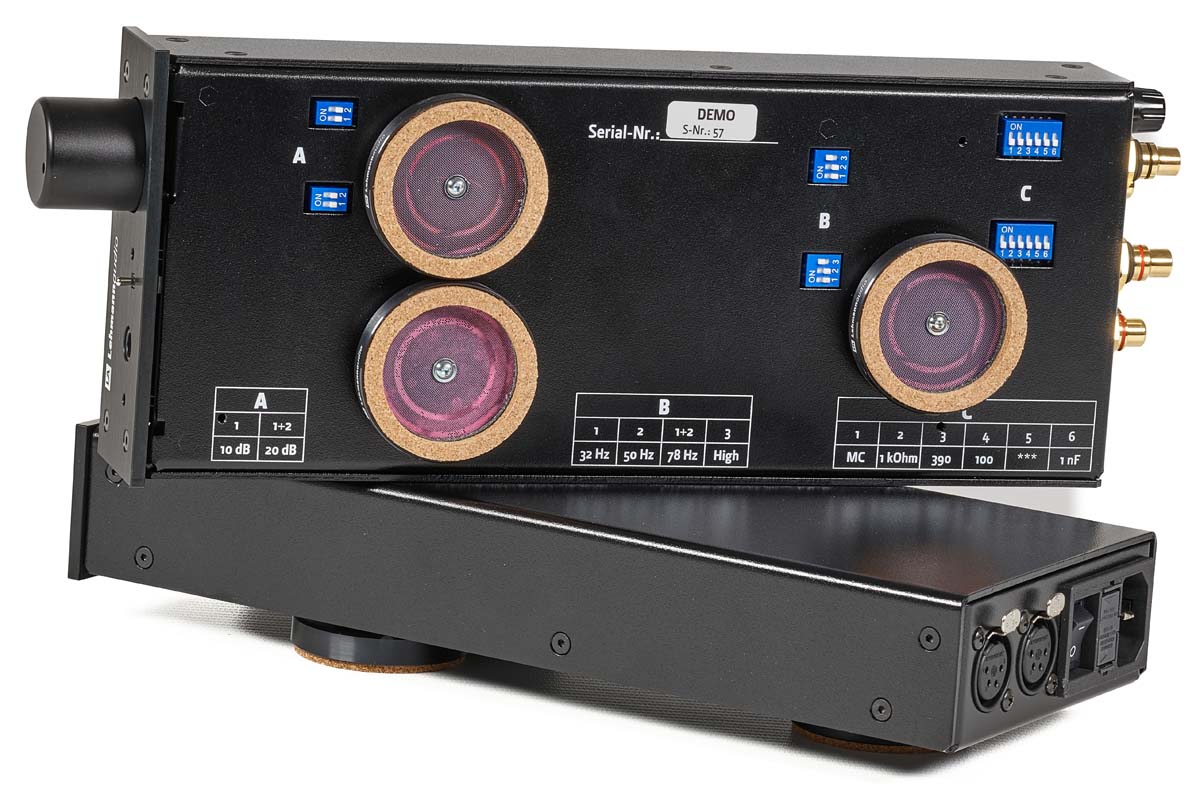 Phonovorverstärker: Eingangsimpedanz (Phono) 7 kΩ, 1 kΩ, 390 Ω, 100 Ω (inkl. Zwischenstellungen per DIP-Schalter wählbar); Steckplatz für Wahlimpedanz