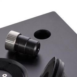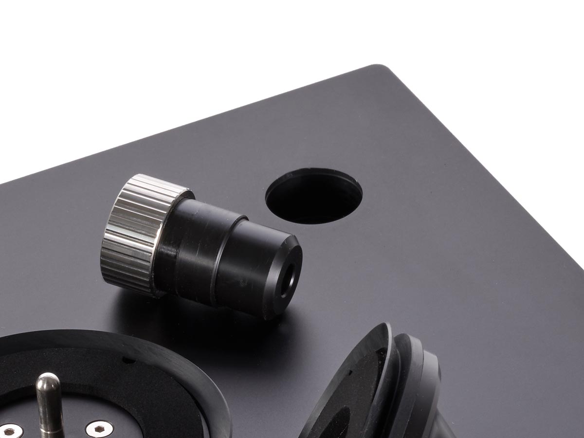 Auf der Rückseite der Levar Twin gibt es eine Kaltgerätebuchse mit Hauptschalter, auf der Oberseite findet sich der Spindel-Mechanismus für den Antrieb der Platte und zwei Arme mit Bürsten fürs Grobe beziehungsweise mit Mikrofaser-Streifen, die sich in der Praxis als perfektes Reinigungswerkzeug erwiesen haben, da sie bis tief in die Rille beziehungsweise Flanke hineingehen. In diesem Ausleger ist auch der Aufsprüh-Mechanismus für die Reinigungsflüssigkeit eingebaut, die man zuvor per Trichter in einen Tank einfüllt.