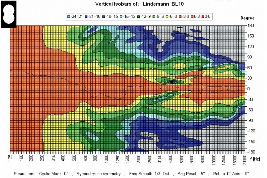 Das Abstrahlverhalten der BL-10 wurde für die horizontale und vertikale Ebene gemessen. Typisch für die Anordnung von Hoch- und Tieftoner übereinander treten in der Vertikalen unvermeidlich im Bereich der Übergangsfrequenz etwas Turbulenzen in den Isobarenkurven auf. Lasst man diese einmal außen vor, dann liegt der mittlere Abstrahlwinkel bei ca. 110 x 110 Grad. Die Box lässt dem Hörer also einen recht großzugigen Bewegungsspielraum, bevor sich die Klangfarbe merklich ändert oder die Hohen abfallen. Die auch bei den höchsten Frequenzen noch schön breite und gleichmäßige Abstrahlung durfte dem Diffusor zu verdanken sein.