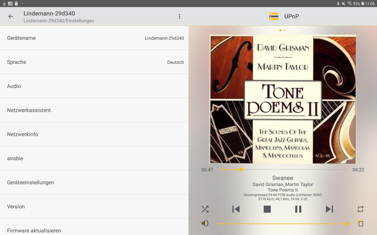 Dass Streaming im Hause Lindemann sehr ernst genommen wird, bestätigt uns Chefdenker Norbert Lindemann: „Wer mich kennt, weiß, dass ich stets für Neues offen bin. Ich bin überzeugt, dass wir schon bald Musik nur noch aus dem Internet haben werden. Datenträger wie LPs oder CDs sind für die junge Generation nur noch ein Retro-Gimmick, die meiste Zeit wird gestreamt. Obschon ich selbst ein großer Fan der Schallplatte bin und dem auch mit dem neuen Musicbook Source Rechnung trage, höre ich, dass HiRes-Streaming inzwischen wirklich sehr, sehr gut geworden ist. Dem tragen wir folgerichtig Rechnung mit unseren Geräten.“ So ist es es nur konsequent, dass unser Leseexemplar über einen Netzwerkspieler verfügt, der ab Werk Musik von den Streamingdiensten TIDAL, Qobuz, Deezer, HighResAudio und Spotify Connect sowie von Musikservern (NAS) und anderen Speichermedien empfängt und unkompliziert in Studio-Master-Qualität abspielt.