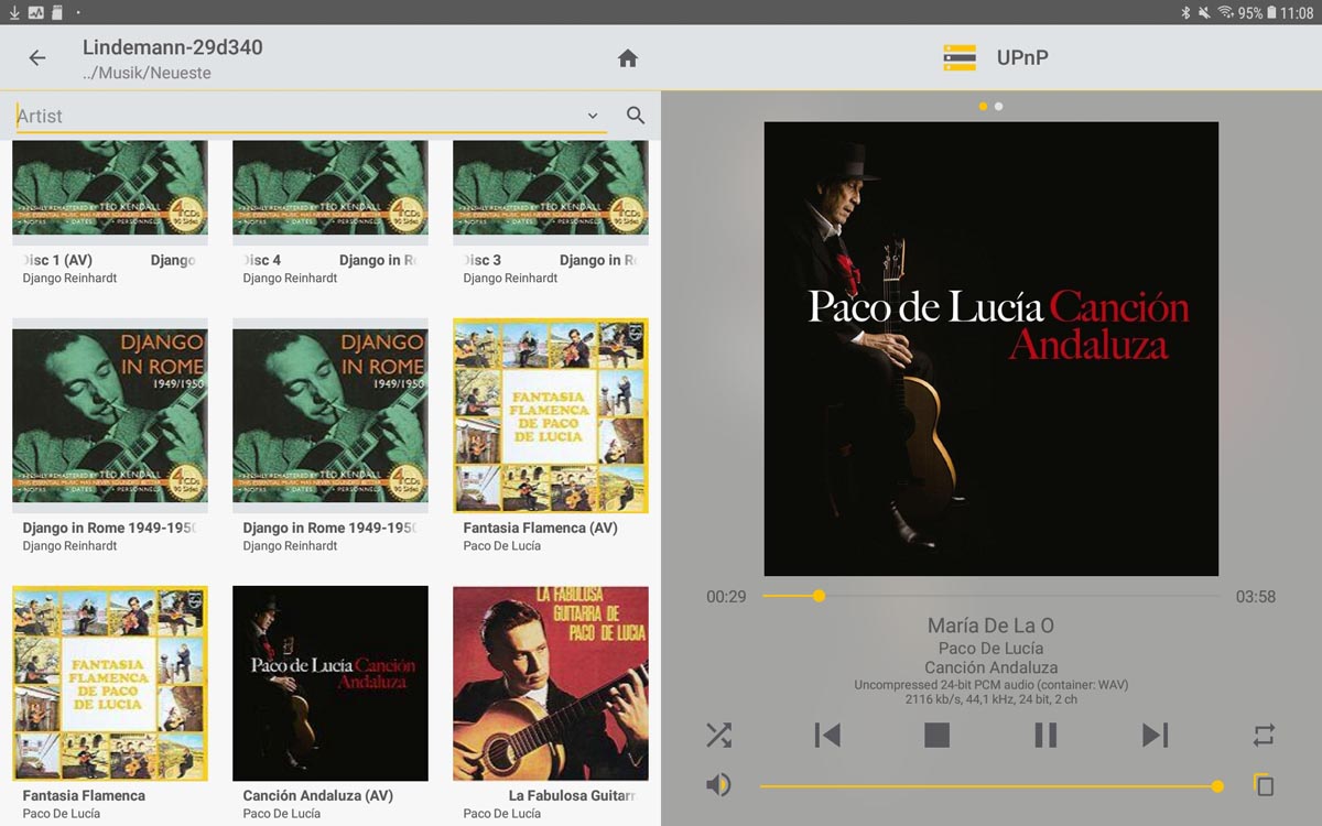 Oha, wir sind bereits mittendrin in der gehörmäßigen Erforschung des Musicbooks. Dann mal wieder „zurück auf Los!“ und ganz von vorne gestartet: Das Lindemann-Buch ist über LAN-Kabel mit dem heimischen Netzwerk verbunden und bekommt die Aufgabe, via App auf den Audiodata MusikServer MS II zuzugreifen. Der Genuss von Canción Andaluza, das Vermächtnis-Album des großen Paco de Lucía, über den Kopfhörerausgang des Musicbook Source soll den Anfang machen. Selbstverständlich arbeitet das Testgerät im DAC-Mode „DSD“ – und bringt damit die ganze Wärme dieses zarten und introvertierten Albums zu gehör, das der Flamenco-Großmeister kurz vor seinem Tode im eigenen Studio aufgenommen hatte. Zur Klangoptimierung waren damals die die D/A-Wandler seines Pro-Tools-Systems gegen weichere, „analoger“ tönende Bausteine ausgetauscht worden. Der sanfte Klang von Pacos Gitarre mischt sich mit innigem Gesang, während Oud, Mandola und Mandoline sowie eine Pepe-Romero-Gitarre mit Zederndecke für neue Klangfarben sorgen. Die arbeitet das Musicbook in allen Schattierungen heraus, frappant ist die Präzision bei der Darstellung von Transienten und eine wirklich bemerkenswerte Räumlichkeit. Mit dem Lindemann-Buch ist das Hören ein Hochgenuss – vergleichbar mit dem Versinken in ein gutes Buch. Der Kopfhörerverstärker kann tatsächlich mit dem Referenz-HPA Violectric V200 mithalten, ohne diesen letztlich zu erreichen. Über die Aktivlautsprecher gehört, hält der spaßige Hochgenuss an. Dann doch mal direkt Standards Vol. 1 vom Keith Jarrett Trio in 24 bit/192 kHz angewählt, und schon bei den ersten zarten Steinway-Tönen wissen die sensiblen Ohren, dass das Musicbook Source der Klangkunst voll zu Diensten ist und diese überragende Aufnahme in all ihrer Schönheit präsentiert. Klingt im direkten Vergleich die Original-LP besser? Ganz schwer zu sagen. Sagen wir’s wie König Salomon: Beide Mal klingt es wie reines Ohrengold, und bequemer ist das Genusshören mittels Server und Musicbook Source allemal – und deswegen ist es das Buch der Bücher für digitalaffine audiophile Leseratten.