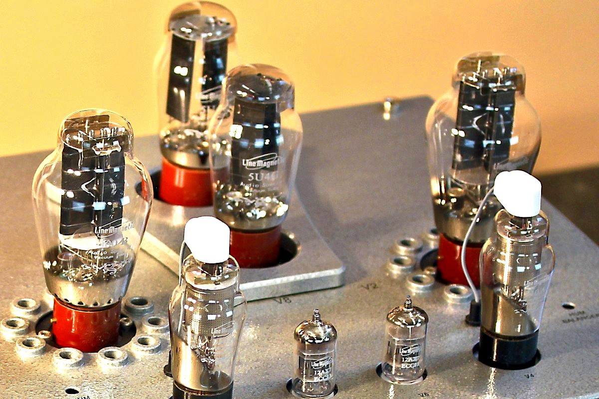Das voluminöse Chassis enthält auch gleich den Netztrafo und beide Ausgangsübertrager – der Grund, warum obenauf ausschließlich Röhren zu sehen sind; unübersehbar die beiden serienmäßigen Gleichrichter vom Typ 5U4G, die kanalgetrennt arbeiten. Als Krönung könnten hier auch zwei WE274A in den Fassungen stecken, dieser im Ur- Verstärker eingesetzte Gleichrichter zählt freilich zu den kaum noch mit Geld bezahlbaren Western-Electric- Antiquitäten. Allerdings würde ich mich nicht wundern, wenn Line Magnetic demnächst mit einer Replik aufwartet (die bis dato gesichteten Nachbauten der 274A fand ich nicht sooo berauschend). Mit den beiden serienmäßig mitgelieferten Gleichrichterröhren vermochte ich mich allerdings auch nicht so recht anfreunden, sie gaben ein vernehmliches Surren von sich, und ich habe sie schnell gegen etwas „moderner“ gebaute 5U4G-Typen ausgetauscht. Um den Röhrensatz zu schonen, wurde der LM-210 IA eine Automatik für sanftes Hochfahren mitgegeben, eine anfangs blinkende LED am Rand des Pegelreglers verkündet letztlich die Betriebsbereitschaft. Dabei ist aus dem Lautsprecher kein Knacks zu hören, eine feine Sache insbesondere bei wirkungsgradstarken Chassis, naturgemäß die Domäne solcher vergleichsweise schwachbrüstiger Eintakter.