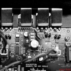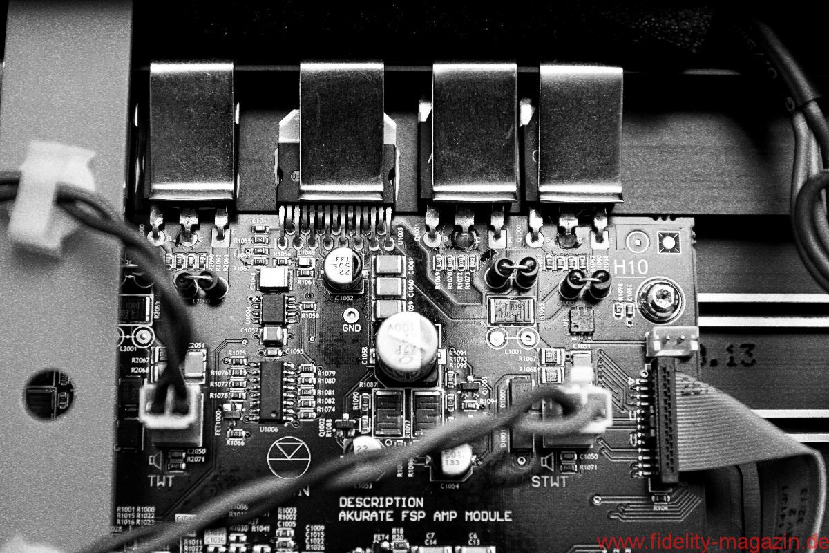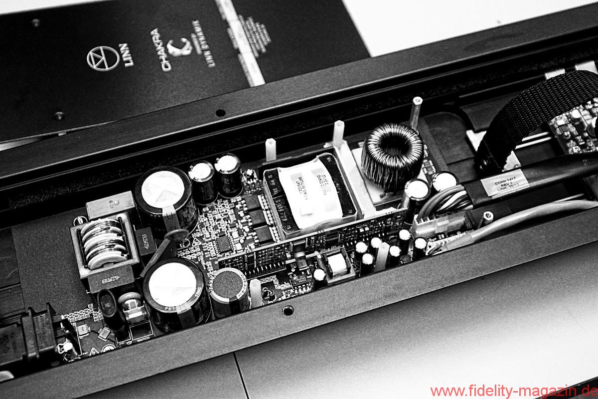 Im proper gerundeten Gehäuse, das mit knapp über einem Meter Höhe äußerst wohnraumtauglich daherkommt, stecken nicht weniger als fünf Wege, die sich auf sechs Chassis verteilen: vier sichtbare, zwei unsichtbare. Letztere pumpen als isobarisches Duo im Boden der Akubarik ordentlich Tiefbass in den Raum, ein „Oberbass“ vermittelt zwischen Tief-und Mitteltonlagen. Darüber versammeln sich die drei kleinsten Treiber, allesamt Kalotten, auf engstem Raum im „3K-Array“, ein tropfenförmiges Druckgussteil, das im unteren Bereich von einer Art Schale umrahmt ist, deren nähere Funktion ich zugegebenermaßen auch nach längerem Nachdenken nicht zweifelsfrei überreiße. Sei’s drum, die Schale gehört zum K-Array einfach dazu. Das Kalottentrio kümmert sich um alles, was oberhalb von etwa 320 Hertz passiert – ein enorm tiefer Einstiegspunkt, der aber von der riesigen 75-mm-Mitteltonkalotte problemlos erledigt wird. Für mich ist dieser Dreizöller übrigens das Sahnestück des Kalotten-Trios, aber das nur nebenbei. (Ich mag halt große Kalotten, weil die so schön breit abstrahlen und den Raum fluten.) Linn deklariert das 3K-Array als Quasi-Punktquelle. Eine weitere Schlüsseltechnologie ist so alt wie Oma Isobarik: die Aktivierung. Jedes Chassis wird von einem eigenen Verstärker angesteuert, die richtige Zuordnung der Frequenzen geschieht nicht passiv über eine herkömmliche (große) Frequenzweiche, sondern elektronisch. Die Umsetzung der von Linn seit mittlerweile vier Jahrzehnten vehement geförderten Aktivierung ist bei der Akubarik äußerst clever gelungen. Als vielleicht deutlichstes Zeichen des Fortschritts sieht man von der Vollaktivierung – nichts! Na ja, fast nichts. Während früher eine riesige schwarze Burg aus Old-School-Endstufen das Wohnzimmer blockierte, versteckt sich heute die komplette Elektronik im – oder besser: am – Heck des Lautsprechers. Elegant schmiegt sich dort ein langes, schwarz eloxiertes Aluminiumprofil an die Rückseite der Akubarik. Das Elektronikmodul ist mechanisch über Gummipuffer vom Lautsprechergehäuse entkoppelt und bietet, obwohl wirklich kompakt, einer ganzen Reihe feinster Linn-Verstärkermodule Platz. Insgesamt sorgen hier, passend zu den verbauten Chassis, sechs Verstärkermodule für mächtig Dampf im Kessel. Sie bleiben dabei aber ziemlich cool. Einen Lüfter oder Ähnliches braucht die Akubarik nicht. Linn hat schließlich nicht umsonst den richtigen Dreh gefunden, um mit selbst entworfenen, hocheffizienten Schaltverstärkern wirklich klangvolle HiFi-Maschinen zu bauen. Und ein paar lässige, marketingtaugliche Namen für die hauseigenen Entwicklungen gehören selbstverständlich auch dazu: Das Schaltnetzteil heißt „Dynamik“, die Endstufenmodule „Chakra“.