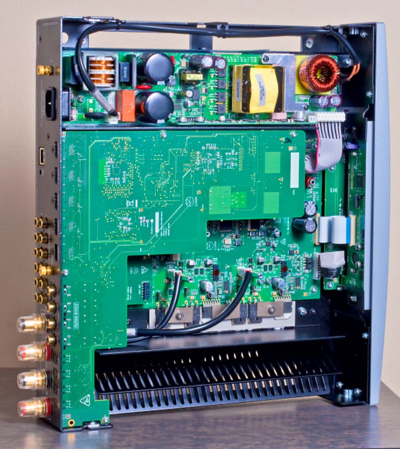Dicht gepackt ist er, der Majik DSM. Auf dem Bild sieht man oben das Schaltnetzteil, unten die Endstufensektion, und eine große Huckepackplatine beherbergt die Digitalabteilung. Davon fast verdeckt finden wir noch eine kleine MM-Phonoeinheit, die auch als Line-Eingang konfiguriert werden kann und im Übrigen sehr manierlich aufspielt. Okay, wer hätte beim Erfinder des berühmten LP12 auch etwas anderes erwartet … Dass alle Schaltungen aus SMD (Surface Mounted Device)-Bauteilen bestehen und damit ihre Deutung fast unmöglich machen, soll uns nicht weiter wundern; Linn war und ist auch bei dem Thema hochmoderne Fertigungstechnik ganz vorne mit dabei.