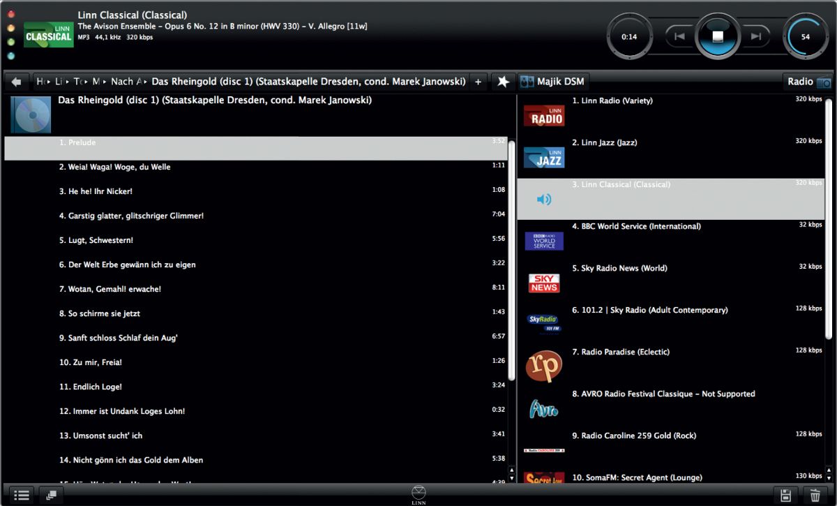 Klanglich geht das Streaming-Modul ebenfalls in die schon beschriebene Richtung. Im Vergleich zu externen Quellen kommt lediglich noch eine besondere Ruhe dazu, jene Ruhe, die gut gemachte Festplattenwiedergabe oft auszeichnet. Nein, nicht die einschläfernde, träge Ruhe langweilig reproduzierender Geräte ist gemeint, vielmehr ist es eine „Entspannung des Hintergrunds“, aus der sich einzelne Klänge dann umso dynamischer entfalten. So stehen die vielen Details der Walküre (etwa das akzentuierte Tremolo in den Geigen bei „in der Esche Stamm leuchtet ein Blitz“) noch klarer vor mir, doch sie verbinden sich wieder zu einem schlüssigen Ganzen. Kurz gesagt glaube ich kaum, dass es einen CD-Player in ähnlicher Preislage gibt, der einer solchen Vorstellung noch Paroli bieten könnte. Faszinierend auch – wieder ein Hinweis auf die überaus geglückte Abstimmung –, wie der Majik DSM mit unterschiedlichsten Lautsprechern klarkommt. Entspannt und knackig treibt er meine kleine Spendor an. An einer größeren B&W muss ich schon weiter aufdrehen, aber immer noch wirkt der Kleine, als hätte er ausreichend Reserven. Auch im Teamwork mit einer wirkungsgradstarken WLM Diva und den entsprechenden Befindlichkeiten macht er eine gute Figur. Allerdings erst, als er richtig warmgelaufen ist. Das ist für so ein Paketchen schon eine echte Leistung!