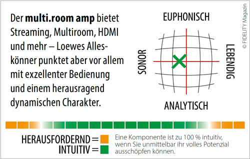 Muss ich mich schuldig fühlen, wenn ich den Kern eines Produkts bewusst ignoriere? Loewe sieht in seinem multi.room amp eine zweikanalige Allround-Lösung für alle Aspekte von Multiroom- und AV-Vernetzungen – endlose Möglichkeiten mit durchdachtem Bedienkomfort. Ich sehe darin eine der günstigsten Möglichkeiten, an ein leistungsfähiges Bi-Amping-Setup zu kommen – mit ein paar sehr brauchbaren Extras.