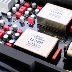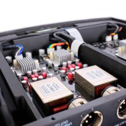 Innen geht es, wie schon erwähnt, klassisch zu: Ringkerntrafo (600 Watt), Doppelmono-Aufbau, vollsymmetrisch, gleichstromgekoppelt, Verzicht auf Über-alles-Gegenkopplung. Der Amp ist bärenstark, die Leistungsangabe lautet 320 Watt in eine 4-Ohm-Last. Per Schiebeschalter an der Rückseite lässt sich zwischen drei Betriebsmodi wählen: Stereo, Doppelmono und „gebrückt“.