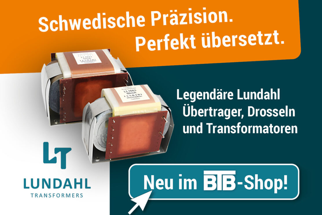 Die Produkte des schwedischen Spezialisten Lundahl Transformers sind ab sofort bei BTB Elektronik im Vertrieb. Der deutsche Spezialist für Röhren- und Audiotechnik ist damit offizieller Distributor der schwedischen Traditionsmarke in Europa. Über den BTB-Shop sollen Übertrager, Drosseln und Transformatoren von Lundahl sowohl für Endkunden als auch für den Fachhandel verfügbar sein – von Einzelkomponenten bis hin zu Lösungen für die Serienfertigung.