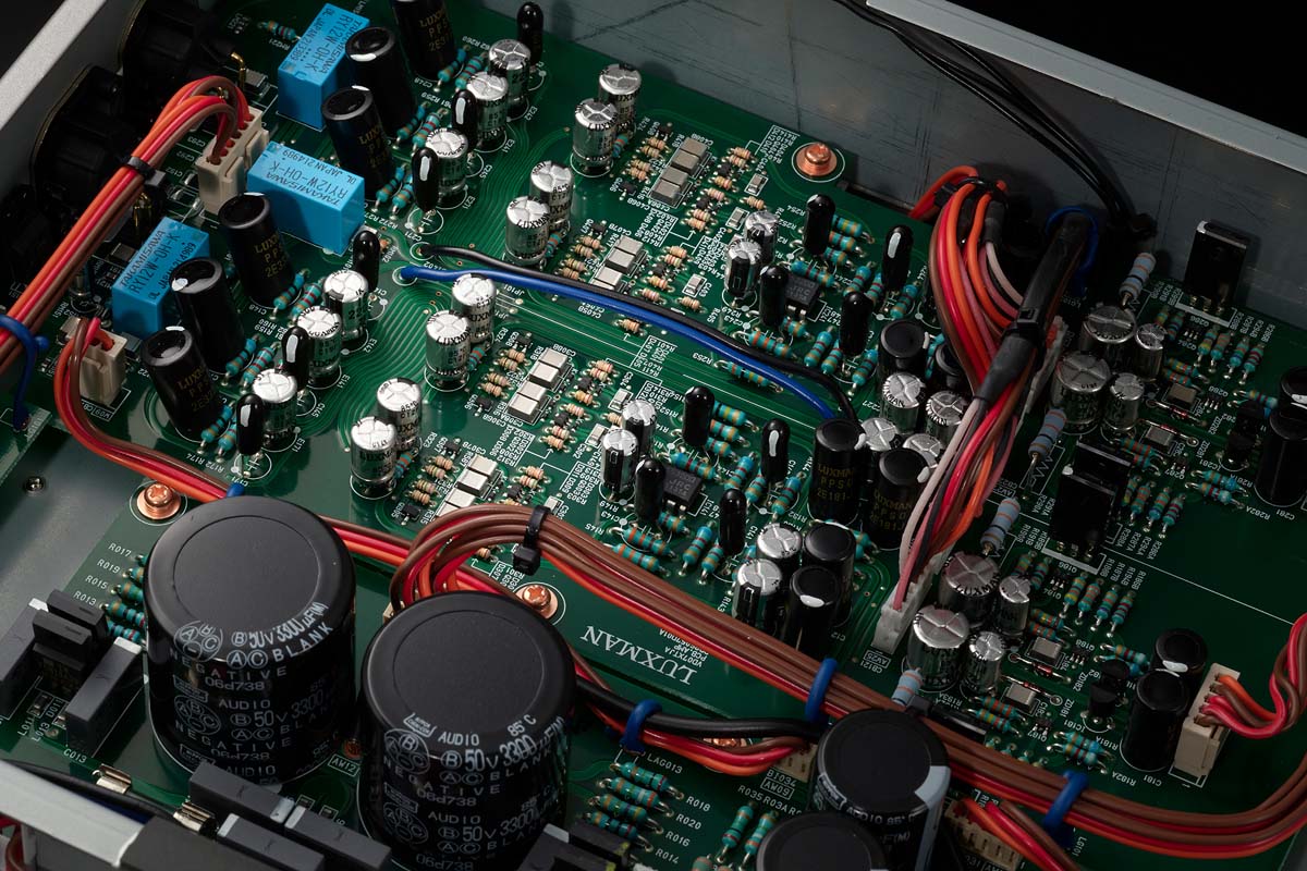 Was hineingeht, läuft – nachdem es im Bedarfsfall den MQA-Decoder passiert hat, denn auch diese Spezifikation wird unterstützt – in die DAC-Chips BD34301 EKV des Halbleiterherstellers Rohm. Der High-End-Chip wurde für musikalische Anwendungen entwickelt und von Luxman zweimalig in monauraler Anordnung verbaut. Neben hervorragenden Messwerten in puncto Verzerrung und digitales Rauschen bieten sie zwei FIR-Filter. Das Chip-Layout setzt auf kurze Wege, um so wenig Laufzeitunterschiede in der Clock zuzulassen. Ein eigener Schaltkreis überprüft dies am Ende noch einmal, bevor die Signale der beiden DAC-Chips in das neu entwickelte I/V-Wandlersystem fließen, das es in vier diskrete, im Mono-Modus operierende Verstärkermodule speist. Gefiltert wird am Ende in der Pufferstufe und nicht mittels eines Low-Pass, was natürlich „runde“ Wellenformen begünstigen soll.