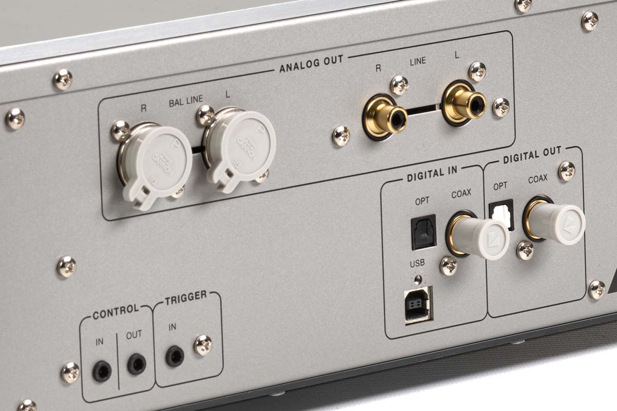 Auf der Rückseite ist vergleichsweise viel los, schließlich soll der Luxman D-07X einige Zuspielmöglichkeiten bieten. Der USB-Anschluss erlaubt sowohl PCM wie auch DSD, die koaxialen und optischen Eingänge unterstützen bis zu 24 Bit/192 Kilohertz. Digital geht es optisch und koaxial heraus, analog mit vergoldeten Cinch-Anschlüssen im 32-Millimeter-Raster oder per Neutrik-XLR.